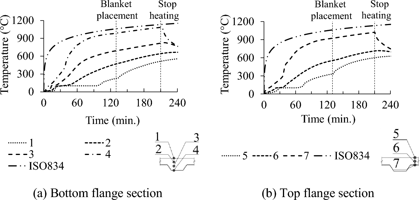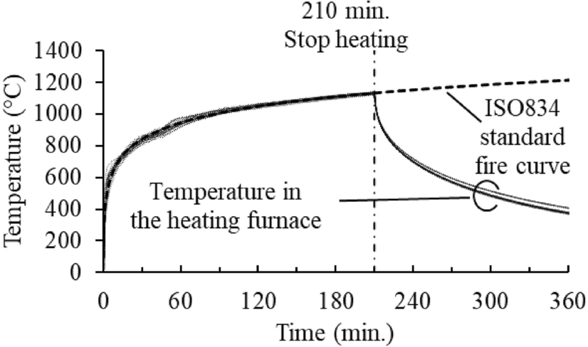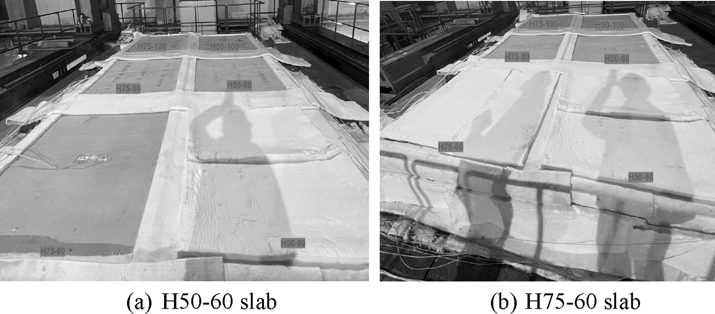 The furnace temperature followed ISO 834 standard fire curve [5]. The experiment was conducted for three and a half hours (until temperatures of unexposed surface in all tested slabs exceeded 200°C). This ensured that the all slabs met the thermal insulation limit, considering that the recorded room temperature on the day of the experiment was 10°C. Current standards define fire resistance based on the thermal insulation criterion as the duration necessary for the unexposed surface of the slab to experience maximum temperature increase of 180°C or an average temperature rise of 140°C, whichever occurs first, under a standard fire (Fig. 8). During experiment, unexposed surface of slab H50-60 and H75-60 were covered by fire protection blanket after 130 min and 175 min, respectively, as shown in Fig. 9, to protect above equipment as maximum recorded temperature of those surfaces got over 350°C at the mentioned time.