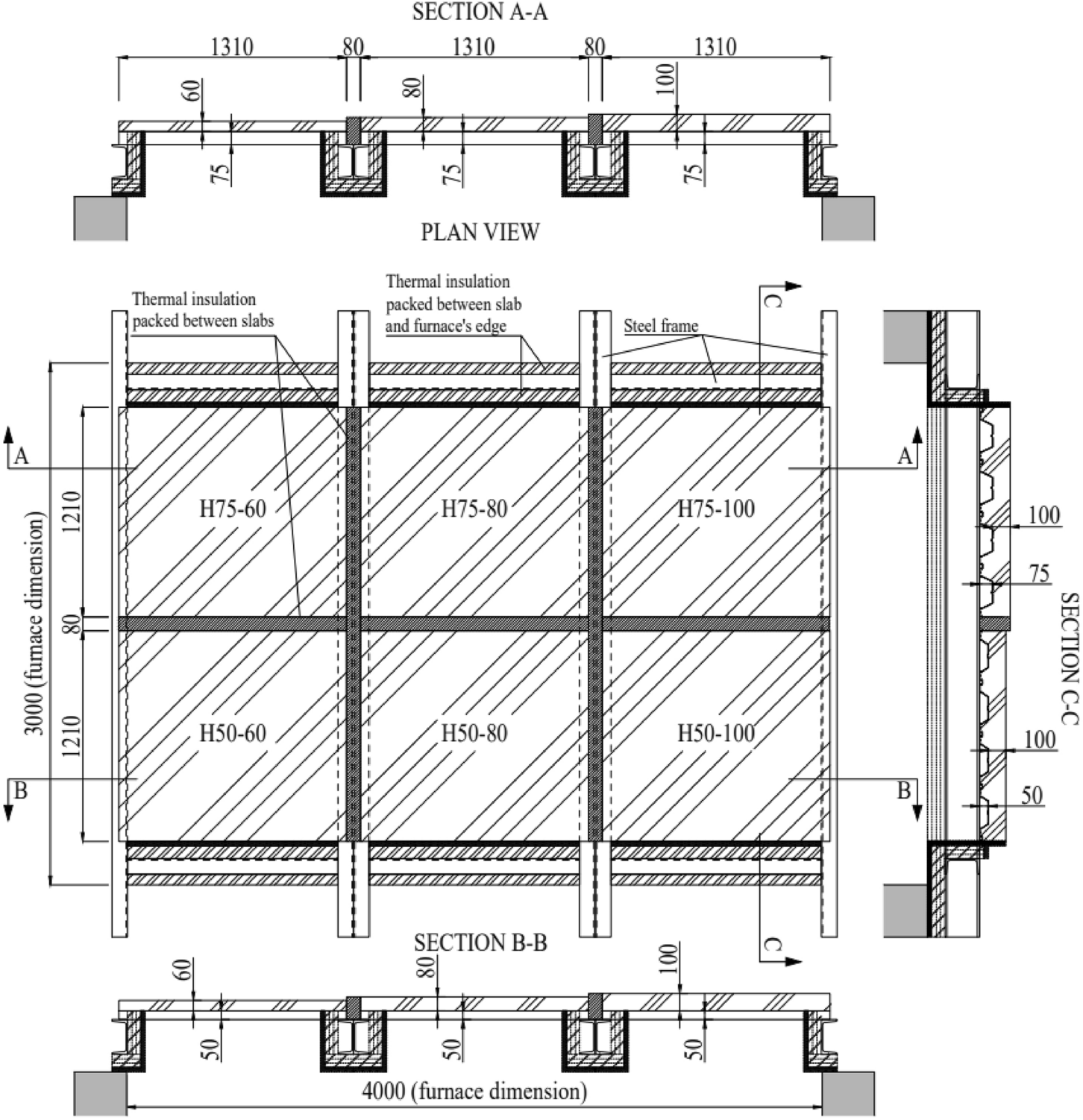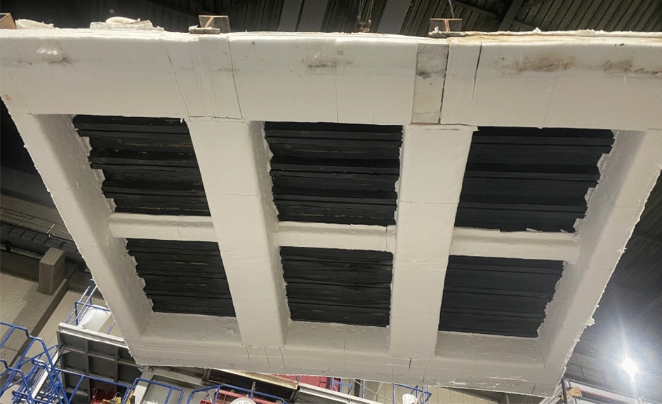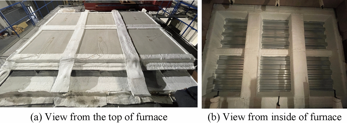 All six slabs were positioned adjacent to each other and installed over a steel frame, which was thermally insulated with calcium silicate boards and protective fiber blankets. Hot rolled C-200 × 90 × 8 × 13.5 steel beams were used to assemble the support frame. The purpose of this assembly work was to test all six slabs at once. There were layers of fiber blanket between slabs for thermal insulation. The composite floor specimen serves as the lid of the furnace, as shown in Figs. 3 and 4.
