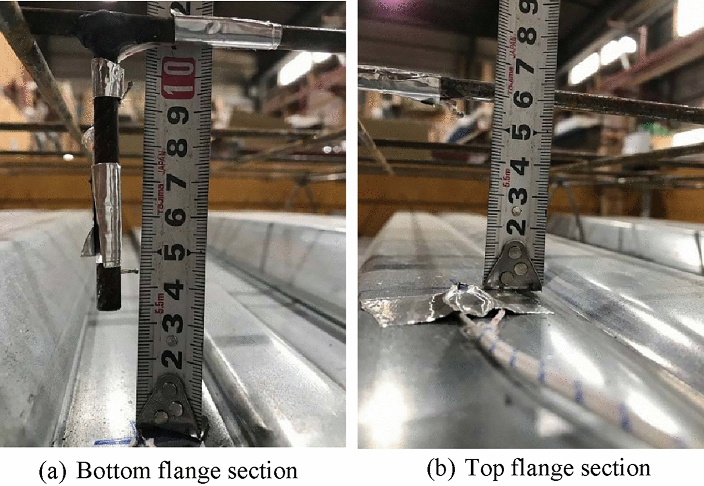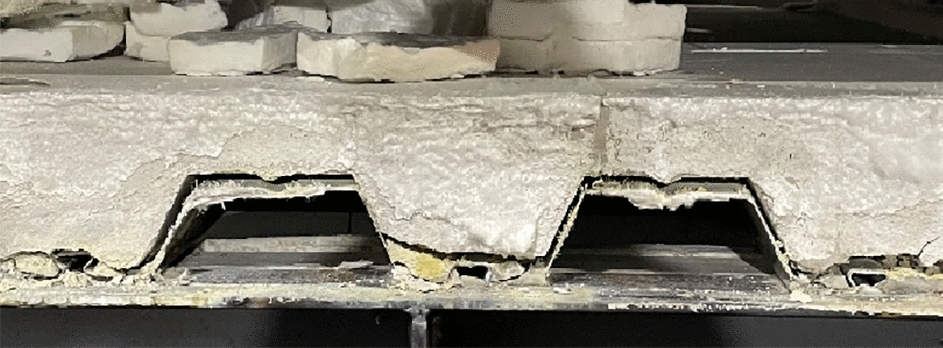 After the fire test, the color of the steel deck turned from silver to black, though they did not melt, as shown in Fig. 12. It also can be seen in Fig. 13 that after the experiment, the steel deck deboned from the concrete, with the maximum measured distance being approximately 10 mm.