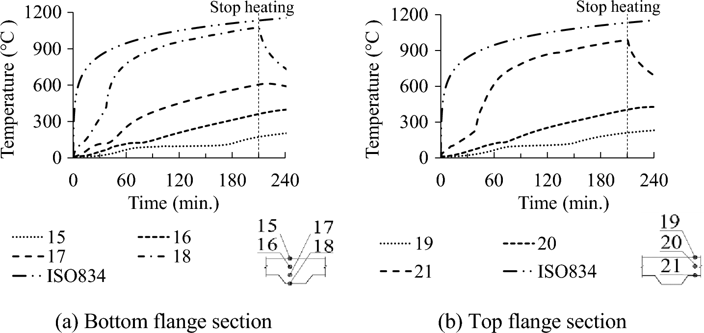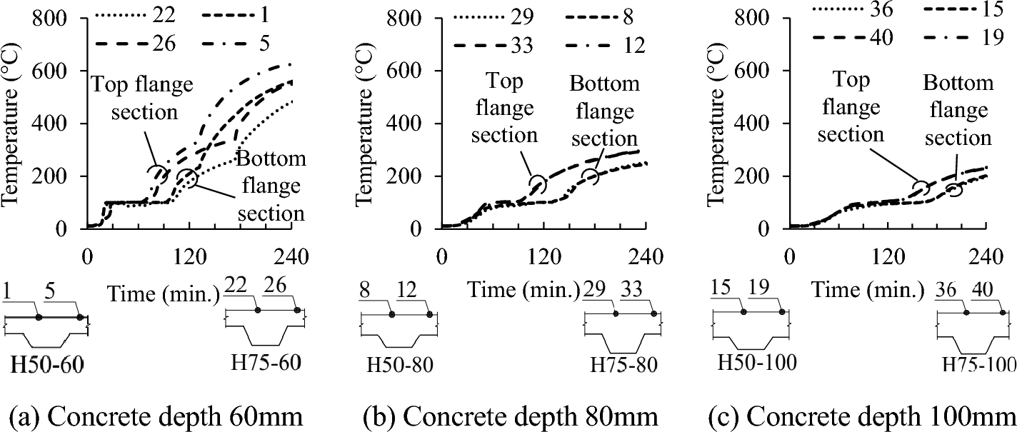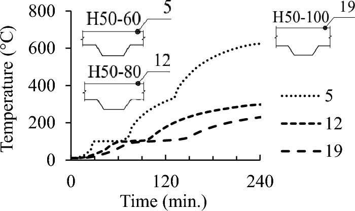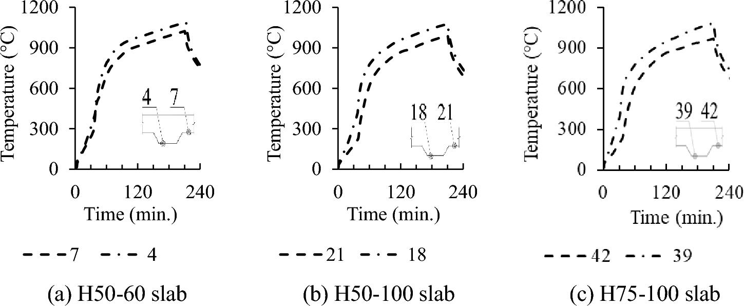 The temperature evolutions at different locations of all the tested slabs are presented in Figs. 14, 15 and 16. In this section, only the experimental data for H50-60, H50-100, and H75-100 slabs are presented as other slabs exhibit similar patterns in terms of data trends. As expected, the temperatures in all thermocouples rose with time, and lower temperatures were observed at higher positions within the concrete layer. At 130 min, the temperature development of thermocouples 1 and 5 of H50-60 slab changed suddenly due to the placement of fire protection on the unexposed surface of the slab to protect the equipment above as mentioned previously. For the temperatures at the unexposed surface, thermocouples above top flange had higher temperatures than those above bottom flange in the same slab because the concrete layer above bottom flange is thicker (see Fig. 20). There were differences in the temperatures at the bottom layer of concrete between the bottom and top flange portions of the slab, as shown in Fig. 17. This discrepancy is due to the rib's thermal shielding effect. The temperature at the bottom surface of concrete was significantly lower than the furnace temperature. Detachment phenomena observed between the steel deck and the concrete after the test are believed to have contributed to these discrepancies.