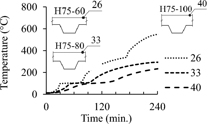 The temperature on the unexposed surface is affected by the concrete depth (see Figs. 18 and 19), with temperatures decreasing as the concrete depth increases. However, the effect of the steel deck’s height on top surface’s temperature is minor (see Fig. 20).