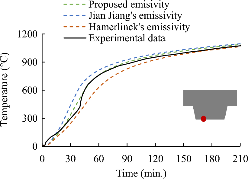 For the emissivity, Hamerlinck [6] suggested a value of 0.1 at temperatures lower than 400°C, which increased to 0.4 at 800°C. This recommendation takes into account that the zinc surface of the galvanized layer strongly reflects the radiation at low temperatures, and the zinc begins to melt at 400°C, eventually disappearing and revealing bear steel at 800°C. Jian [13] proposed a value of emissivity of 0.1 for temperatures below 400°C, and 0.7 for temperatures above 800°C. For temperatures between 400 and 800°C, a linear variation between 0.1 and 0.7 was suggested. This approach aligns with the temperature-independent emissivity of steel deck recommended in EC4 [3], which is 0.7. In this study, the emissivity of the steel deck under 400°C was maintained at 0.1. However, since Japanese products were utilized, when the temperature exceeded 800°C, the value was set to 0.6, consistent with the temperature-independent emissivity of steel recommended in the AIJ recommendation [18]. For temperatures between 400 and 800°C, a linear interpolation was employed. These values resulted in the most accurate predictions in terms of temperature profiles within the composite slabs, as depicted in Fig. 21. The emissivity values for the three methods are illustrated in Fig. 22.