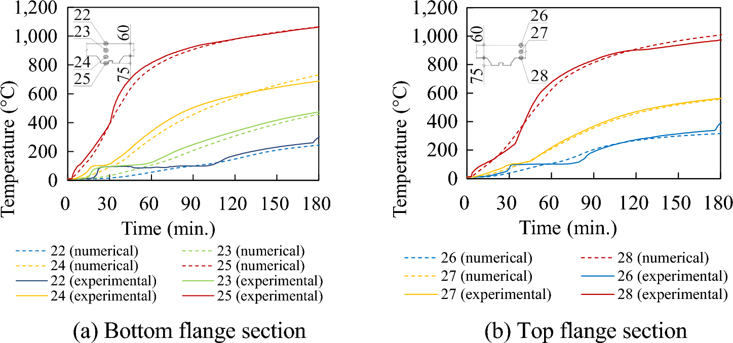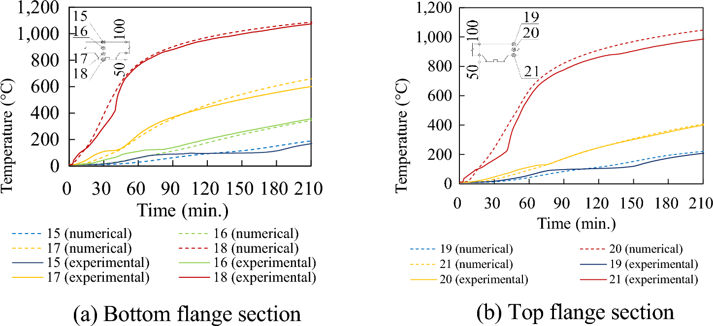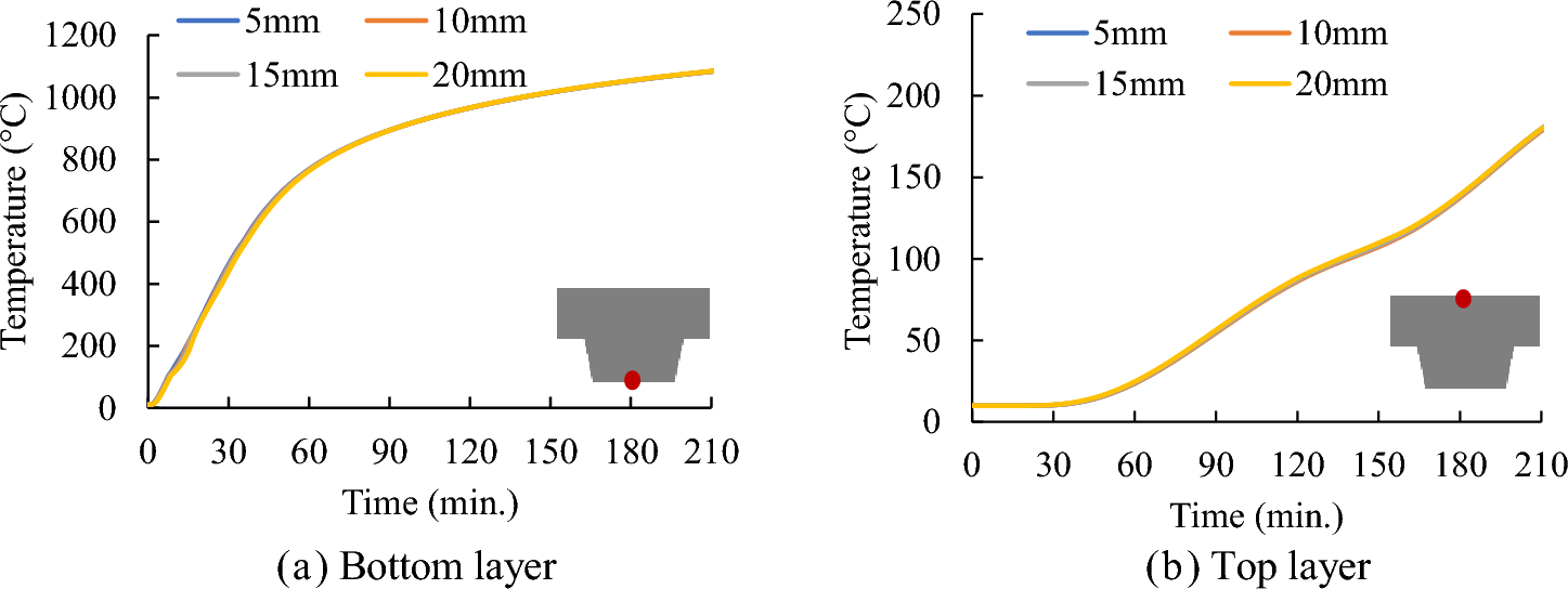 A mesh size analysis was conducted, considering various dimensions for the slab mesh: 5 × 5 mm, 10 × 10 mm, 15 × 15 mm, and 20 × 20 mm. Fig. 24 shows a comparison of the calculated temperatures at several specific locations, including the bottom position of the bottom flange section and the top position of the bottom flange section, for the H50-100 slab case using the four different mesh sizes. There are minor differences between the data obtained with different mesh sizes. Therefore, a mesh size of 10 × 10 mm was chosen for use in all composite slab models. This choice was made to minimize computational time required for calculations and ensure precise node selection in conjunction with the corresponding locations of thermocouples.