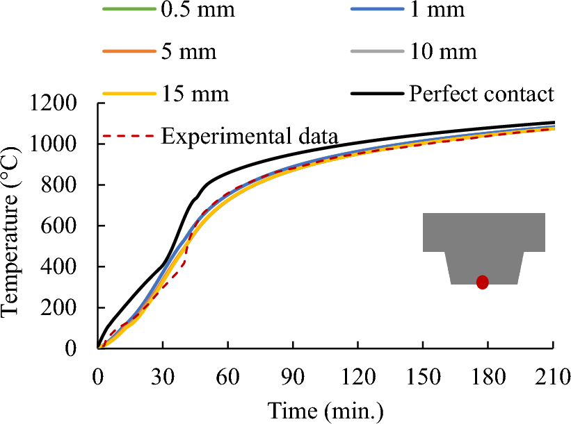 Early in the fire exposure, as observed in the experimental tests, the profiled steel deck separated from the concrete slab [2]. The maximum measured detachment depth was approximately 10 mm. This detachment had a direct impact on the isotherms within the slab cross-section and was considered in the numerical model as a cavity. An analysis was conducted to investigate the effect of detachment depth on temperature development inside the composite slab. Six values of detachment depths were considered: 15 mm, 10 mm, 5 mm, 1 mm, 0.5 mm, and 0 mm (representing perfect contact). Fig. 25 shows the comparison of calculated concrete temperature at bottom surface location of the H50-100 slab for each detachment depth. It is evident that minor differences exist between temperature data for detachment depths ranging from 0.5 mm to 15 mm, while significant differences are observed compared to the case of perfect contact. This suggests that detachment phenomena should be taken into account when modeling composite slab under elevated temperatures. In this study, a detachment depth of 1 mm was adopted.