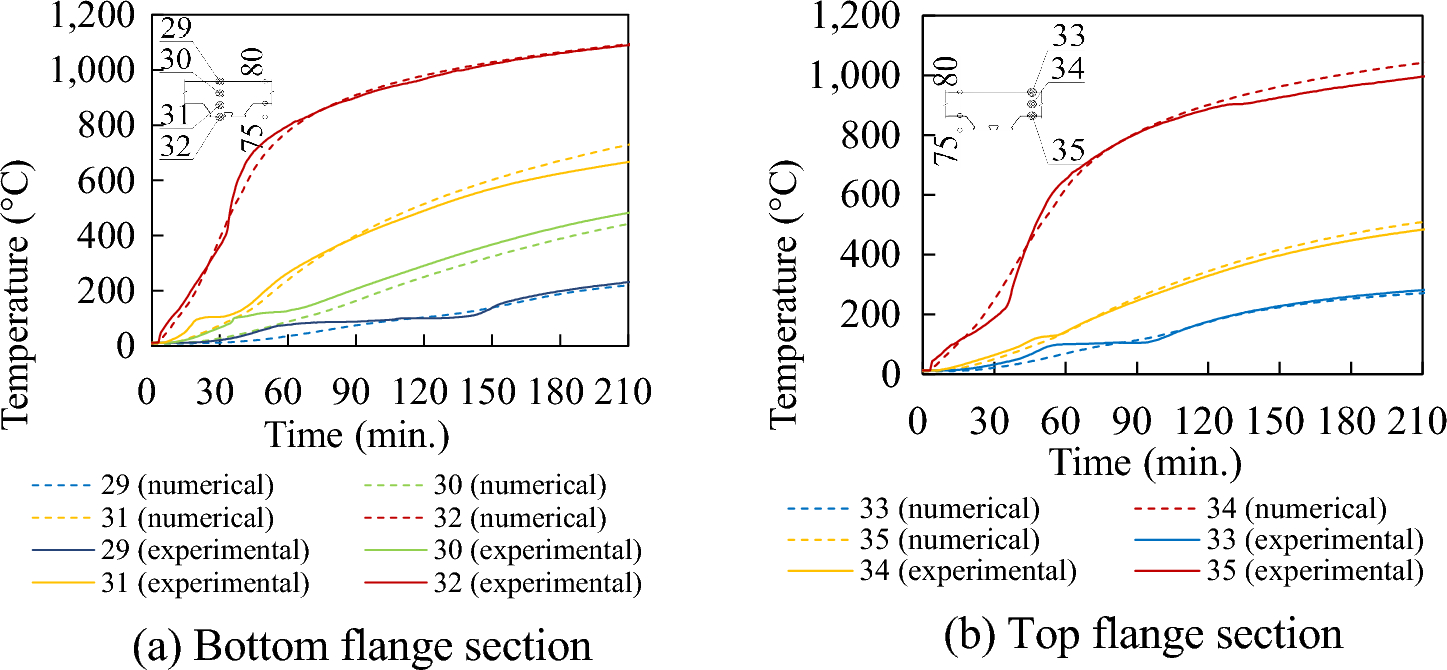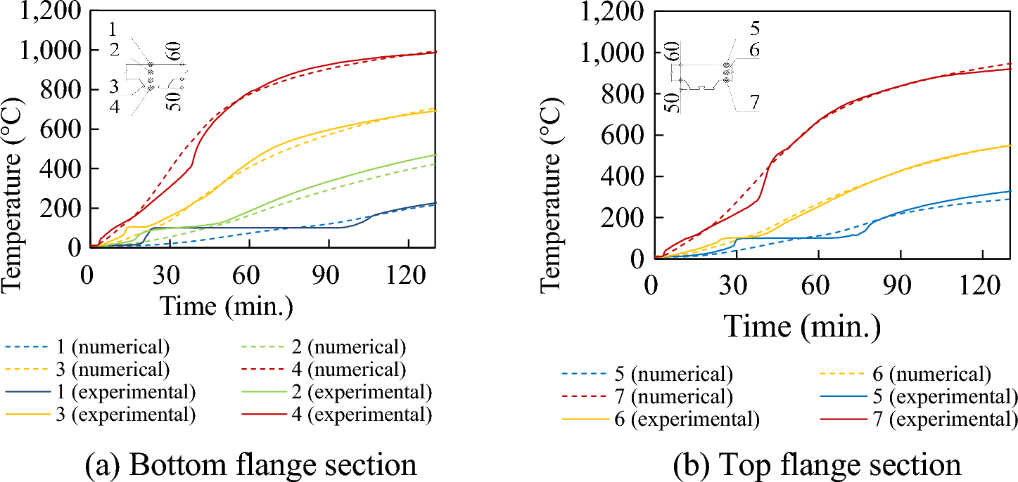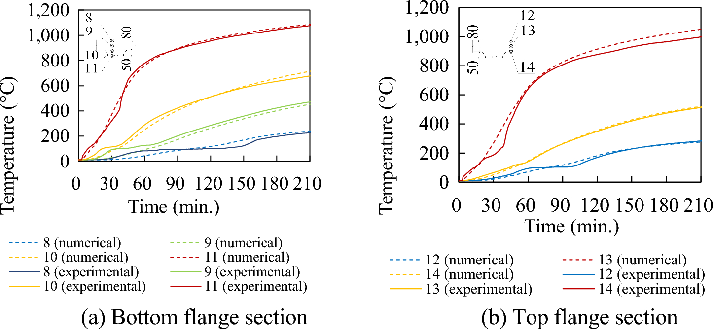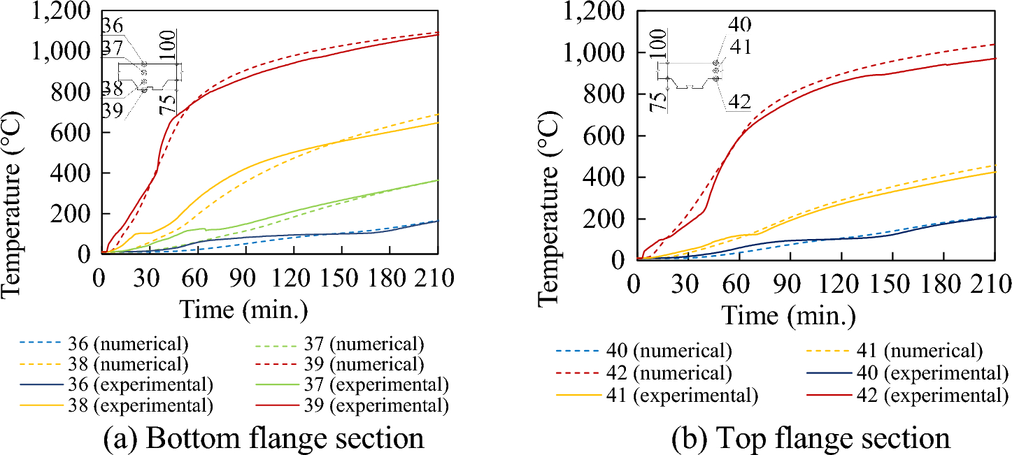 The agreement between the experimental and numerical temperatures data demonstrates that the thermal parameters of the materials provided by EC4 [3] were sufficient for the numerical modeling of Japanese composite slabs.