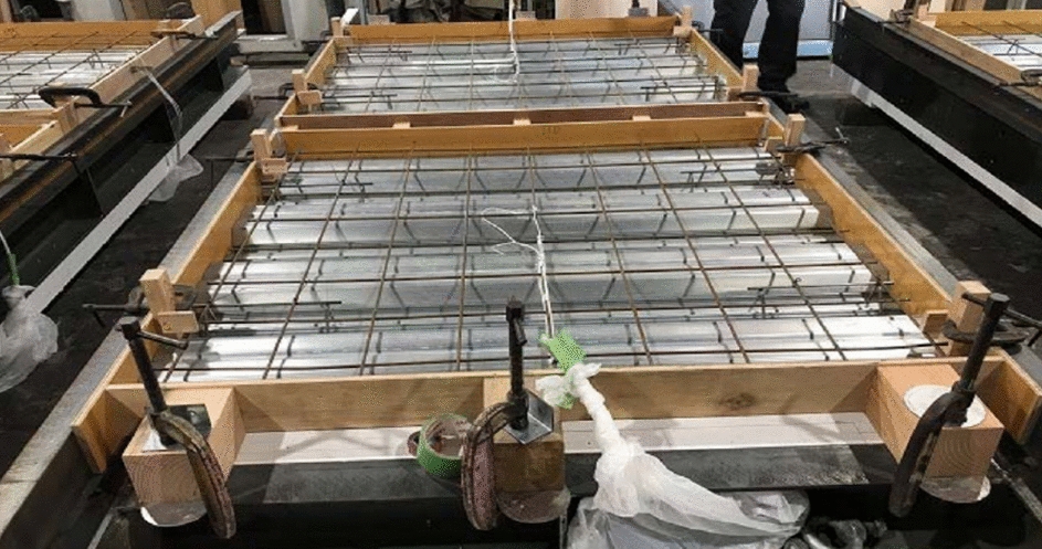 The tested composite slabs had dimensions of 1.3 m in length and 1.2 m in width. Slab reinforcement (provided primarily to control cracking in the transverse direction) consists of 150 × 150 mm welded wire reinforcement placed 30 mm below the top surface of the slabs. A photo of the composite deck before concrete placement is provided in Fig. 2.