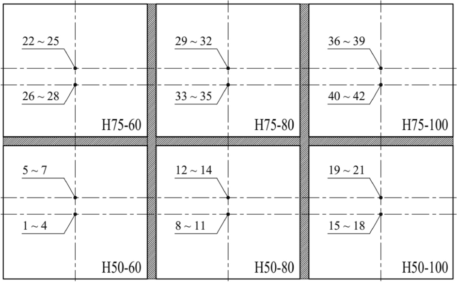 Six composite slabs with different sections, namely H50-60, H50-80, H50-100, H75-60, H75-80, and H75-100 were prepared. The experiment utilized two types of galvanized steel deck: S50-12 and S75-12, with cross-section heights of 50 mm and 75 mm, respectively. The thickness of both steel deck types was 1.2 mm. To investigate the temperature distribution at various concrete depths, the experiment considered three values of height of the upper continuous portion of the slab: 60 mm, 80 mm, and 100 mm. The detail cross-sectional dimensions and designated names of each composite slab are shown in Fig. 1 and Table 1.