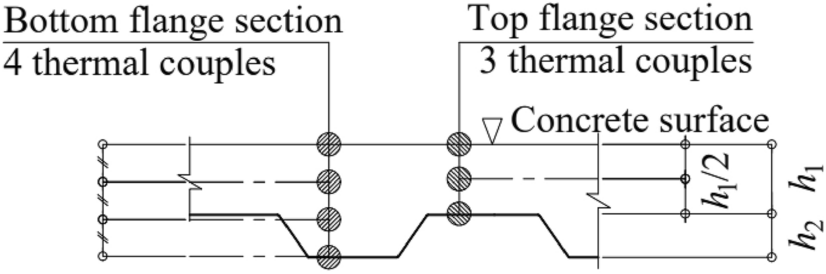 Inside the composite slabs, 42 thermocouples were placed to measure the temperature distribution over the cross-section, as shown in Fig. 6. There was a total of seven thermocouples in each slab: four in the bottom flange section, three in the top flange section, which were placed in the mid-span of the middle strip. In order to prevent any displacement of thermocouples situated within the concrete layer during the pouring process, aluminum tape was used to fix the lowest thermocouple to the steel deck. The thermocouples in middle height were attached to additional rebars as illustrated in Fig. 8. The top thermocouple was affixed to the top surface of the concrete after concrete consolidation. In each temperature measured section, thermocouples were evenly located at regular intervals throughout the concrete layers. The cross-sectional allocation of thermocouples is shown in Fig. 7.