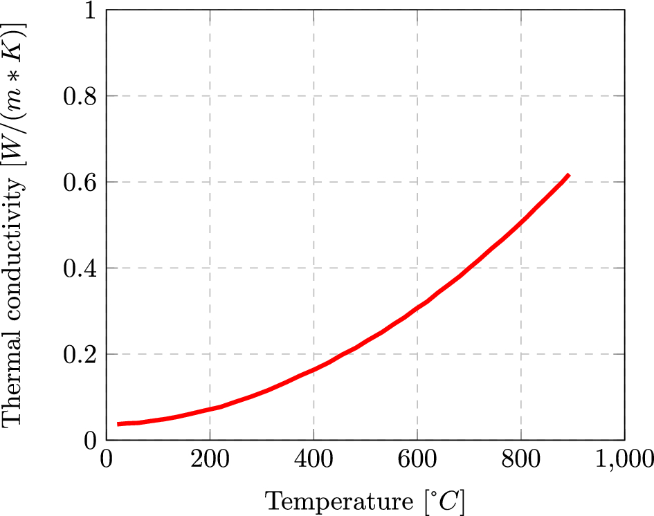For the density of mineral wool a constant value of 50 kg/m3 was chosen. The temperature-dependent specific heat capacity and thermal conductivity are presented in Figures 9 and 10.