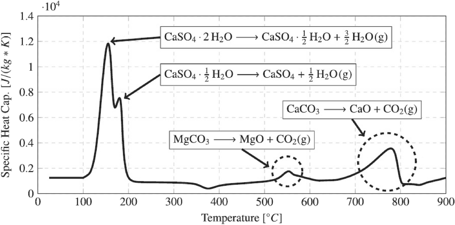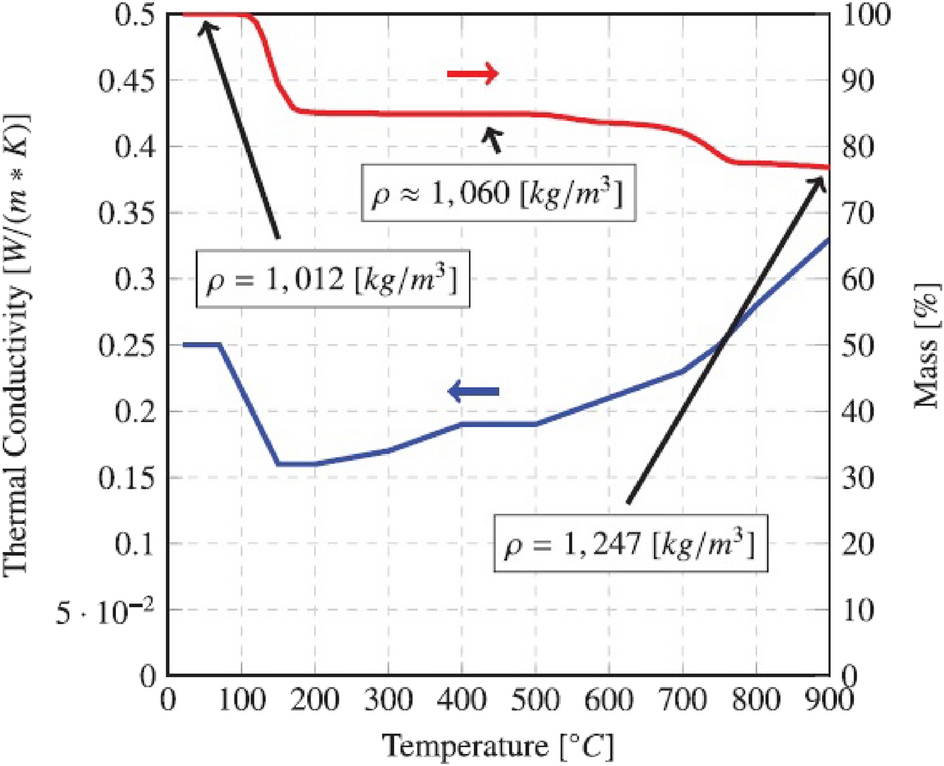 For the gypsum, which mainly consists of \(\text {CaSO}_{4} \cdot 2 \text {H}_{2}\text {O}\), a constant density of 1012 kg/m\(^3\) was defined. Furthermore, the temperature-dependent specific heat capacity was defined as published by Prieler et al. [24] (see Figure 11). In Figure 11 a de-hydration process caused by two chemical reactions can be identified at approx. 150\(^{\circ }\)C. These reactions are endothermic and the reaction enthalpy is considered by the increase of the specific heat. During the heating process some minor components of the gypsum are participating in chemical reactions too. However, the effect on the specific heat capacity is limited. It can be seen from Figure 11 that water vapour is released from the solid gypsum leading to a mass loss. This mass loss can be seen in Figure 12. The highest mass loss occurs due to the release of water vapour. Above 500°C the other components of gypsum release \(\text{CO}_{2},\) but the reduction of the mass is minor. Furthermore, the density of gypsum seems to increase during the heating process (see density values in Figure 12). This fact can be explained by the shrinkage of the gypsum during the de-hydration process. Here, it has to be mentioned that the specific heat capacity is related to the initial density. Thus, a fixed value for the density in the simulation is justified. In addition, the thermal conductivity of gypsum is shown in Figure 12. During the de-hydration process the thermal conductivity is reduced. However, during further heating the thermal conductivity increases due to the better connection between the gypsum crystals when they partially melt together [24].