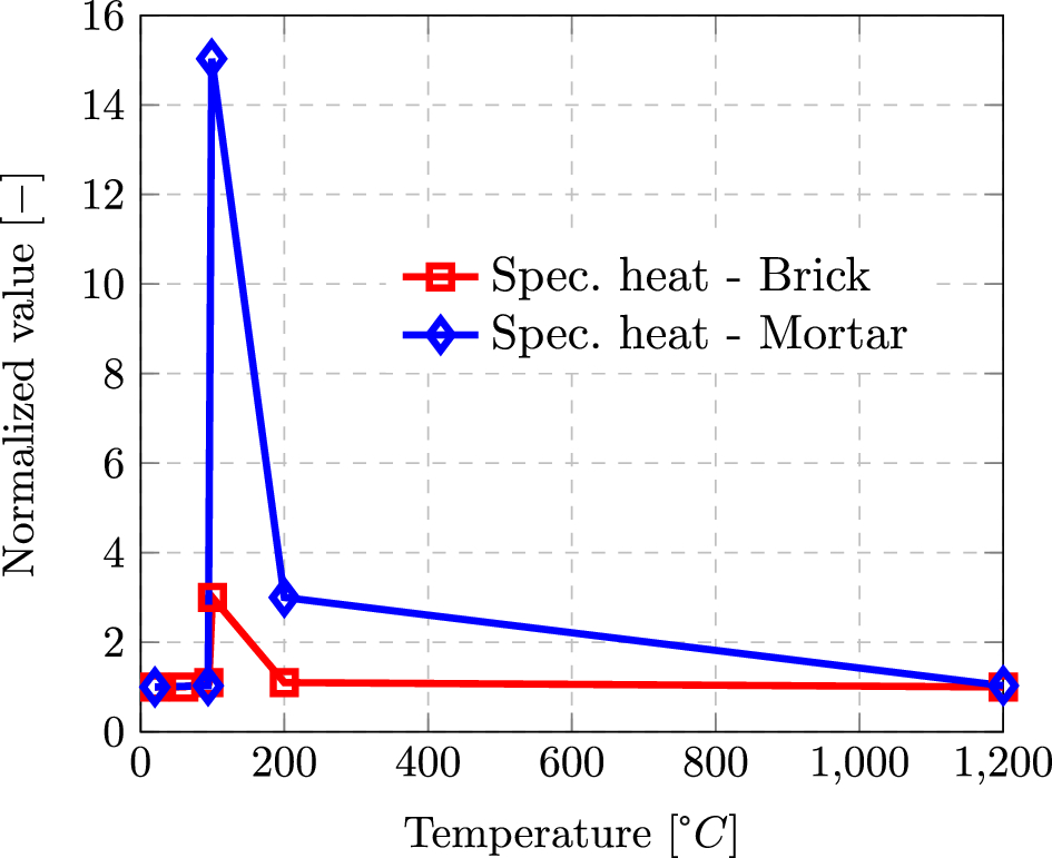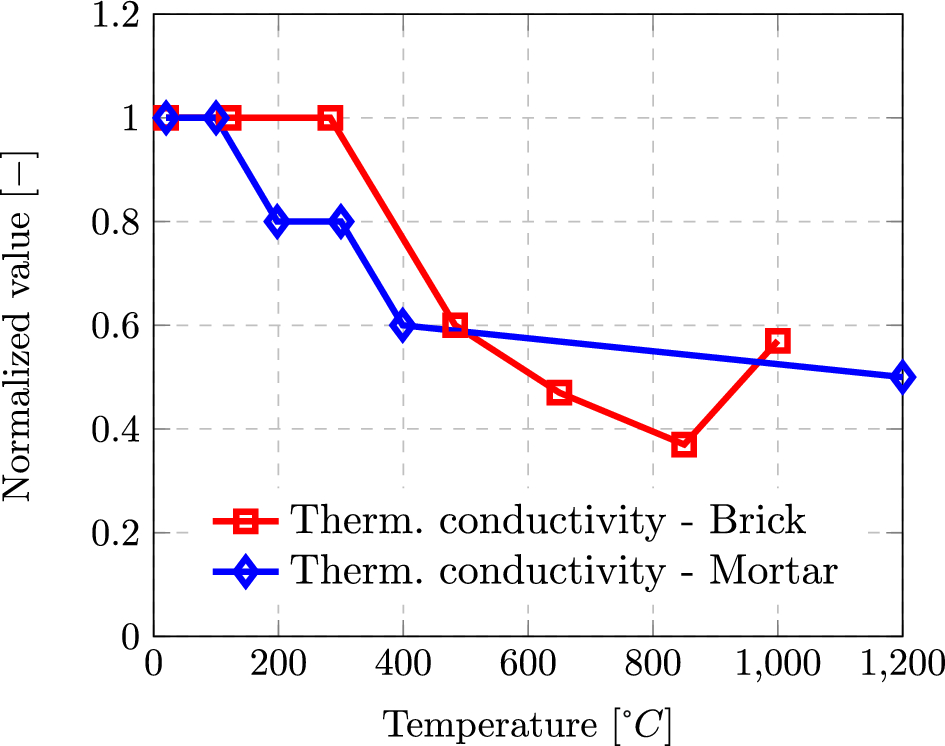 In the wall only brick and mortar were used as building material. Thus, temperature-dependent material properties for brick and mortar are necessary. In the work from Nguyen and Meftah [16], the material properties for both building materials were summarized. In Table 2 the material properties for brick and mortar at ambient temperature are presented.