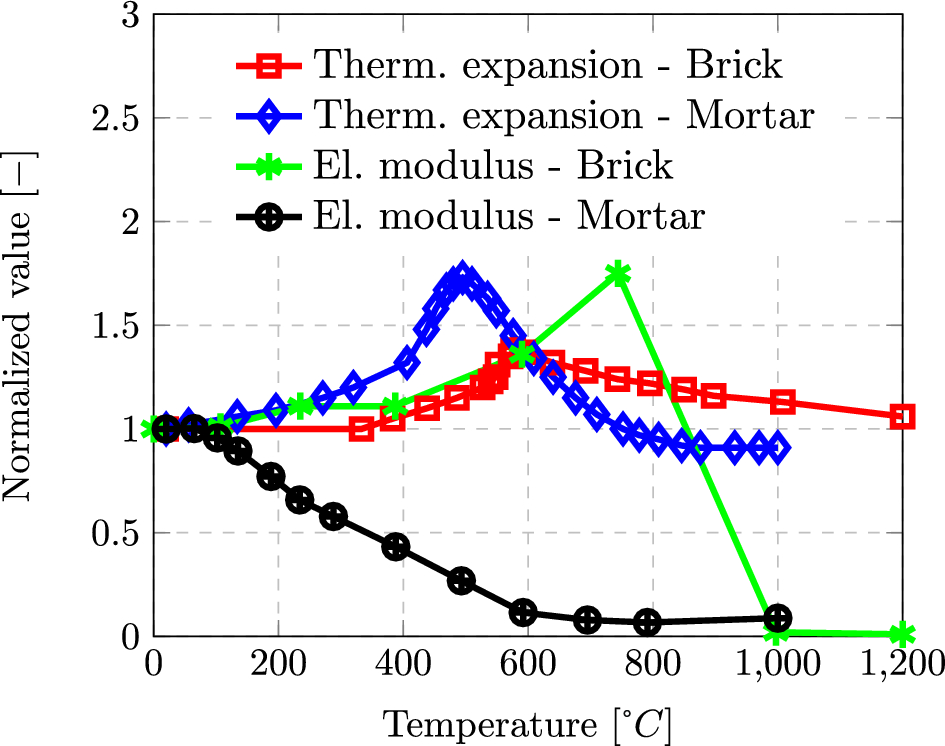 Referred to the material properties at ambient temperature, the temperature-dependent material properties are presented in Figures 13, 14 and 15. Figure 13 shows the specific heat capacity for brick and mortar. Similar to gypsum, an increase of the specific heat can be detected right above 100\(^{\circ }\)C, where a de-hydration process in the material occurs. Also the thermal conductivity of brick and mortar decreases at higher temperatures due to the de-hydration process (see Figure 14). In contrast to gypsum, an increase of the thermal conductivity at higher temperature was not observed for brick and mortar. In addition, the temperature-dependent thermal expansion as well as the elastic modulus of brick and mortar are presented in Figure 15. The thermal expansion coefficient for brick and mortar starts to increase at the beginning of the heating process, with its maximum at approx. 500\(^{\circ }\)C (mortar) and 600\(^{\circ }\)C (brick). After the peak value the thermal expansion coefficient decreases to the initial value. The elastic modulus of mortar shows a steadily decreasing value at higher temperature levels. In contrast, the value of the elastic modulus for brick increases during the heating process until the elastic modulus is approx. 1.75 times higher compared to ambient temperature. When the temperature is above 800\(^{\circ }\)C the value of the elastic modulus drops significantly.