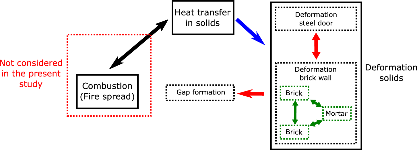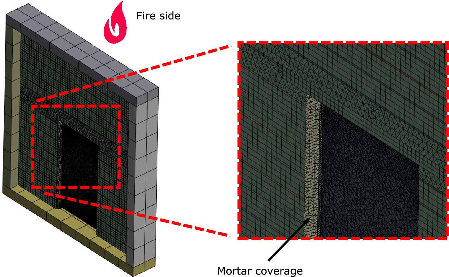 As mentioned in “Brick Walls Under Fire Exposure” section, numerical approaches to consider the thermal and structural analysis were limited to the masonry brick wall (e.g. [17]) or the test specimen (e.g. [23]) alone. However, the mechanical interaction between the wall and the test specimen (door in the present case) has to be considered for an accurate prediction of the fire response (see [26, 29]). Thus, the focus of the numerical methodology was on the mechanical interaction between the masonry brick wall and the test specimen as highlighted in Figure 16. The gas phase combustion inside the fire resistance test furnace was not considered. Instead, a thermal boundary condition at the fire exposed side was defined in accordance to the measured temperature in the furnace. In the present study the thermal analysis was carried out before the structural analysis. As a consequence, there are two different simulations also using different numerical grids (see “Numerical Grid and Boundary Conditions” and “Radiative Heat Transfer in the Brick Voids” sections). The following issues will be addressed by the numerical methodology: