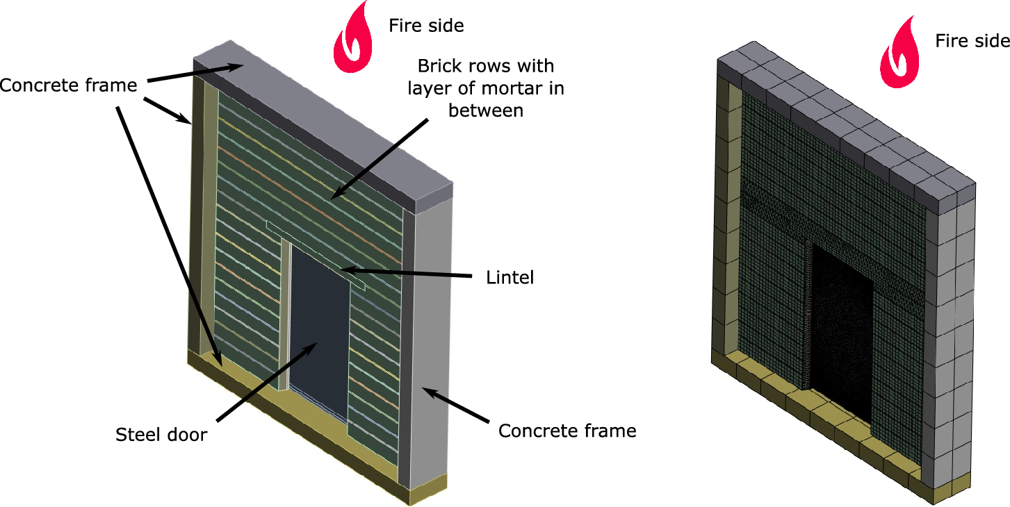 In contrast to the thermal analysis, where the heat transfer through the brick and the door was simulated separately, the structural analysis considers the mechanical response of both simultaneously. Thus, the mechanical interaction between the brick wall and the test specimen can be predicted.
