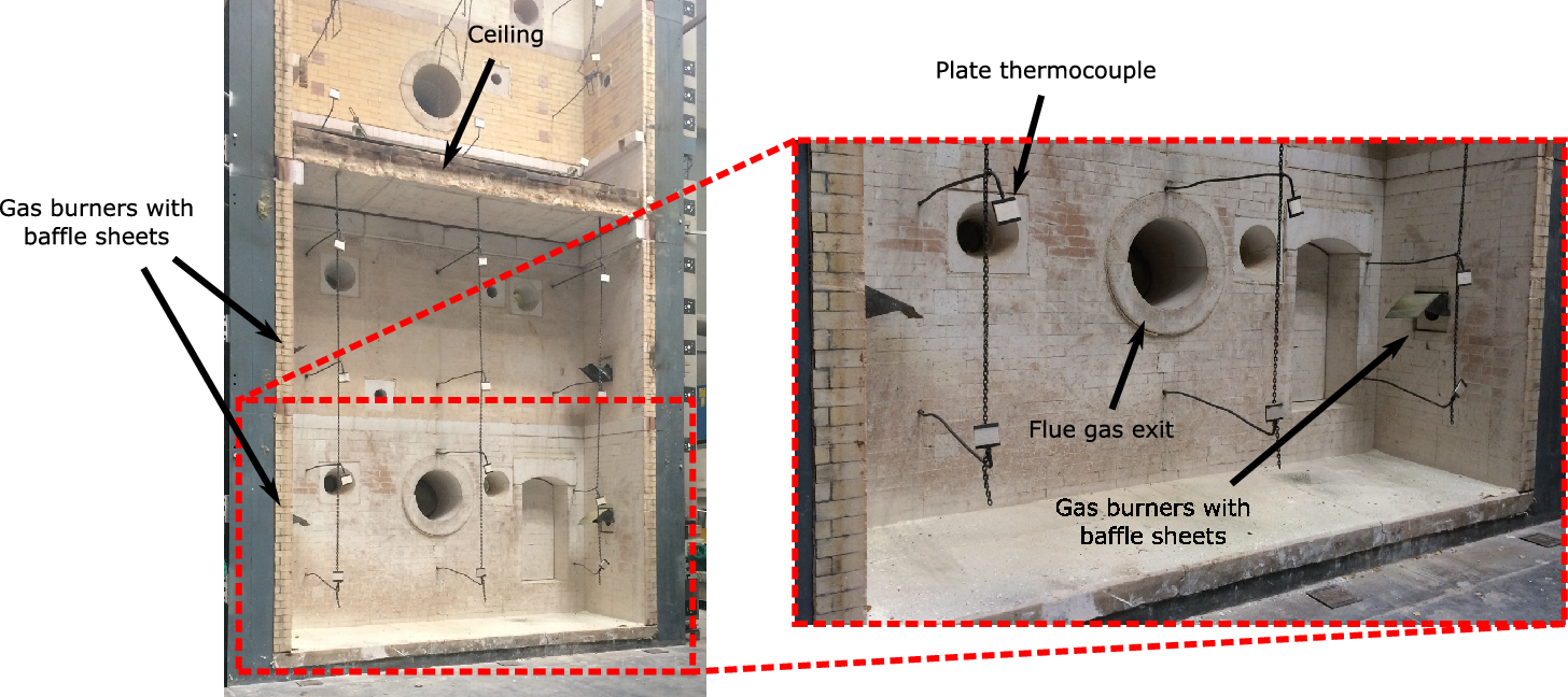 For the experimental campaign in this study a fire resistance testing furnace was used, which is shown in Figure 1. The furnace dimension was \(4\times 4.5 \times 1.25\) m and it was operated by four natural gas fired burners at the side walls of the furnace. The walls of the furnace were made of bricks and fibre insulation panels with an overall thickness of 0.345 m (back and side walls) and 0.23 m (ceiling) as described in Prieler et al. [22]. Each burner was equipped with baffle sheets to deflect the flame and optimize the temperature distribution in the furnace (see [21]). The temperature in the furnace was observed by 12 plate thermocouples, which were arranged in a distance of 10 cm from the fire exposed side of the brick wall/test specimen. The exact position of the plate thermocouples is shown in Prieler et al. [21]. The average temperature from all 12 thermocouples has to be in close accordance to the pre-defined temperature trend from the standard [6]. The measured average temperature in the furnace for each FRT as well as the pre-defined temperature trend can be seen in “Temperature Inside the Furnace and at the Test Specimen” section. The testing time of all FRTs was 40 min. At the front of the furnace the masonry brick wall with the embedded fire safety steel door was placed.