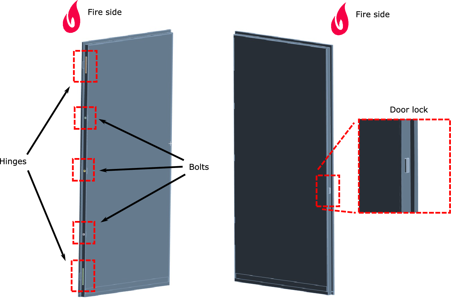 The fixed connections between the door leaf and the frame (bolts, hinges and lock) cannot separate in the simulation. However, in the real FRT a failure of these components cannot be excluded, but was not observed during the FRT.