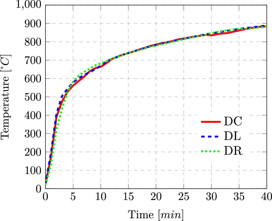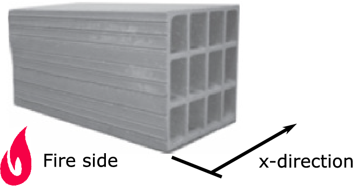 The masonry brick wall was made of hollow-bricks (thickness: 17 cm; height: 0.249 cm; length: 0.308 cm) and was placed inside a concrete frame. The length of the bricks was adapted slightly at the edges of the wall to fit into the concrete frame. The frame was then fixed at the front of the fire resistance testing furnace. Embedded into the wall was a fire safety steel door, however, at different position for each FRT as it can be seen in Figure 2. When the door was in the left and right position (denoted as DL and DR), it was placed in a distance of 20 cm from the edge of the masonry brick wall. In the third FRT, the door was arranged in the centre of the wall (denoted as DC). Between the row of bricks mortar was used for a better connection. In contrast, no mortar was used between the bricks within the same row. The voids of the hollow-bricks were not filled with mortar in general, however, a partially filling of the voids with mortar in the course of the construction cannot be avoided but was not considered in simulations.