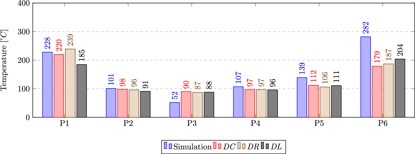 The heat transfer through the test specimen (steel door) was simulated separately. The numerical grid for the steel door was made of tetrahedrons with an overall number of approx. 92,000 cells. Similar to the brick wall, the energy equation from Equation 1 was used with the corresponding material properties. At the door’s centre the heat transfer through the steel shell, the gypsum board and the mineral wool can be assumed as 1-dimensional. However, the heat transfer at the door’s edges and corners is 3-dimensional. This is caused by the geometry of the door’s debate. Furthermore, the heat transfer at the edges and corners of the door is faster compared to the door’s centre because of the higher thermal conductivity of the steel shell (thermal bridge). This can be seen in Figure 24. In a distance of 25 mm from the door’s edges and corners (see P1 and P6) the temperature is significantly higher compared to the centre of the door or in a distance of 100 mm from the edges (see P2, P4 and P5). The measured temperatures in all cases (DC, DL and DR) showed the same trend, which clearly indicates that the heat transfer cannot be approximated as 1-dimensional. Since the heat transfer through the door is 3-dimensional, an adequate polynomial function of the temperature in the door cannot be derived for the structural analysis. Therefore, another method was used to transfer the calculated temperatures from the thermal to the structural analysis. For this purpose, the temperature data for each time step at each position in the door were stored in data files. In the structural analysis the thermal expansion of the door will be calculated based on the temperature data stored in the files. It has to be mentioned that the numerical grid for the thermal and structural analysis are different. Therefore, the temperature data have to be mapped on the numerical grid for the structural analysis using a profile preserved methodology. More detailed information about the data transfer from the thermal to the structural analysis using data files can be found in Prieler et al. [22, 23]. It has to be mentioned that this methodology is more demanding in terms of memory usage and calculation time compared to the application of the polynomial function used for the brick wall.