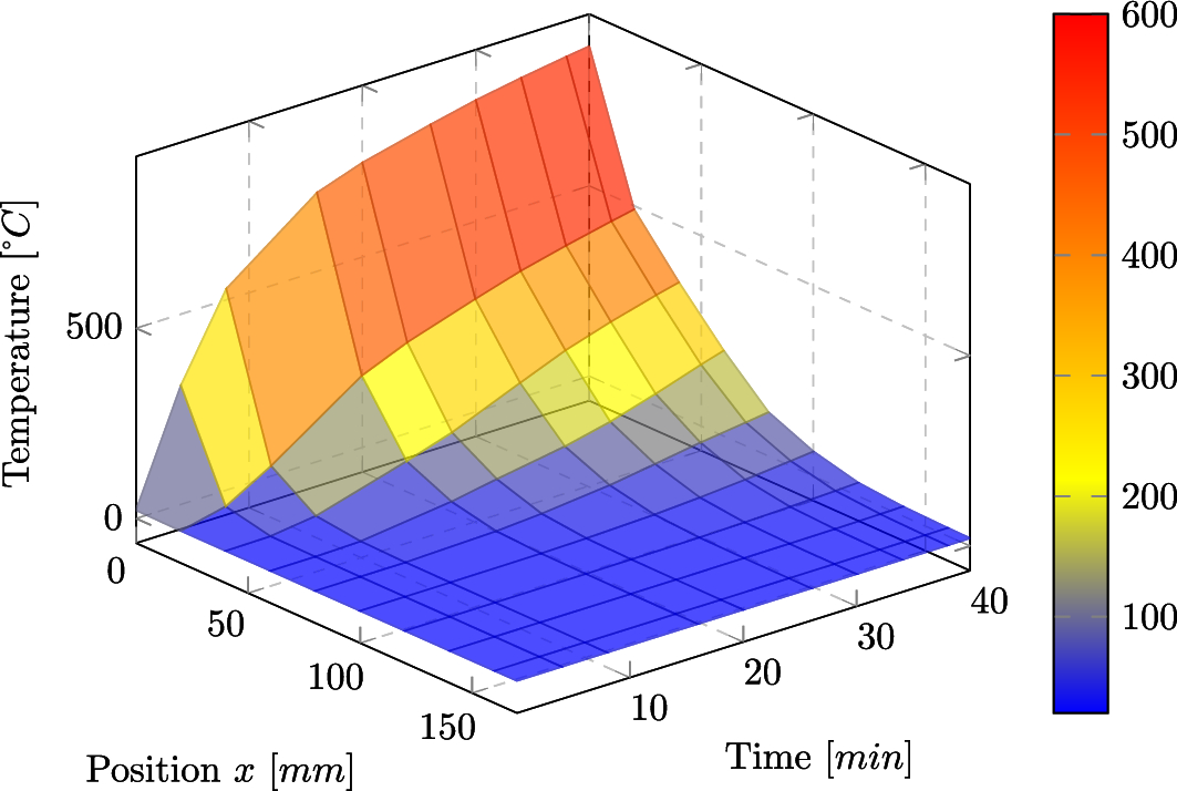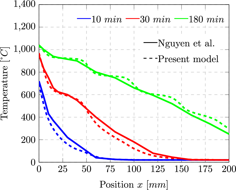 For both simulations (brick wall and test specimen) the same boundary conditions were applied. At the fire exposed side (e.g. position \(x = 0\) in Figure 17) the measured temperature at the plate thermocouples inside the furnace were used in conjunction with a convective heat transfer coefficient of 25 W/(m\(^{2}\) K). In addition to the convective boundary condition, a radiative boundary condition was defined, where the measured temperature inside the furnace as well as an emissivity of the surface with a value of 0.9 were used. At the fire unexposed side a constant temperature of 20\(^{\circ }\)C was defined and the heat transfer coefficient as well as the surface emissivity were 4 W/(m\(^{2}\) K) and 0.9, respectively. The values for the heat transfer coefficient are highly dependent on the local flow situation. At the fire exposed side the value of 25 W/(m\(^{2}\) K) should represent the forced convection caused by the burnt gases inside the furnace. It is an average value considered as constant for the entire fire exposed surface. The value at the fire unexposed side represents the heat transfer caused by natural convection. For the emissivity the same constant value at both sides was assumed. At the fire unexposed side, the emissivity has a low effect, since the surface temperature there is at a moderate level until the end of the FRT. At the fire side the surface temperature is significantly changing over time, and, as a consequence, also the emissivity. A detailed knowledge about the temperature-dependent emissivity of the bricks is not available. Thus, a constant value of 0.9 was chosen.