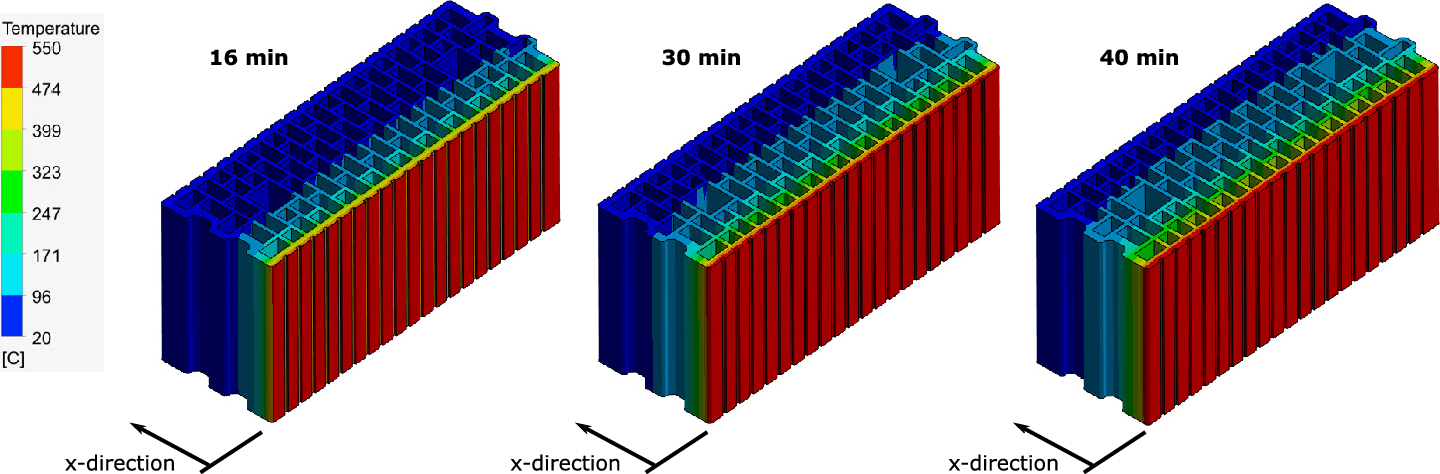 For the thermal analysis of the brick wall a single brick with the voids was considered (see Figure 17). In addition, the geometry, which was used for the simulation, also considers a small part of the neighbouring bricks (see green and brown zone in Figure 17). The numerical grid for the thermal analysis of the brick wall consists of approx. 19,000 cells (mainly hexahedrons and a minor number of tetrahedrons). For the tetrahedrons SOLID87 elements were used in ANSYS, which are 3-dimensional elements with 10 nodes. In contrast, the hexahedrons were 3-dimensional elements with 20 nodes (SOLID90). The same element types were used for the thermal analysis of the steel door. A detailed description of the element types can be found in [3]. In the solid cells the energy equation (see Equation 1) with the corresponding material properties was solved. Furthermore, the radiative heat transfer in the voids was predicted (see “Radiative Heat Transfer in the Brick Voids” section). Although the voids of the bricks are irregularly shaped, the heat transfer through the brick can be seen as 1-dimensional. This can be seen in Figure 27, in which the temperature front temperature front develops homogeneously over the length of the brick (not x-direction). Therefore, the calculated temperatures in the brick were used to derive a polynomial function depending on the time and the position (x-direction; \(x = 0\) stands for the fire exposed side) in the brick. This polynomial function was later applied for the structural analysis. The advantage of using a polynomial function is that in the structural analysis the local temperature at each node can be easily calculated for each time step, and no data transfer from the thermal to the structural analysis is necessary. As a consequence, the memory usage and the calculation time can be decreased. Furthermore, for the thermal analysis of the wall only the thermal analysis of one brick is needed, which allows a fine grid to be used in the thermal analysis avoiding a high calculation time.