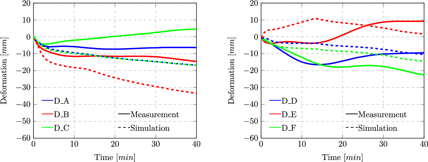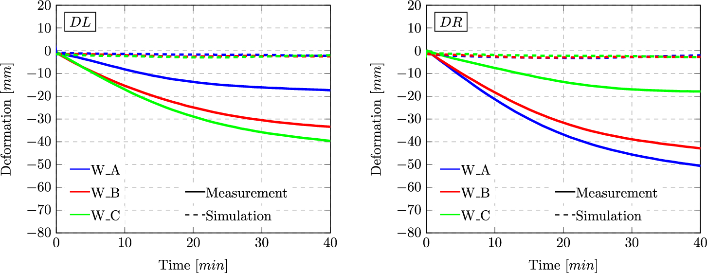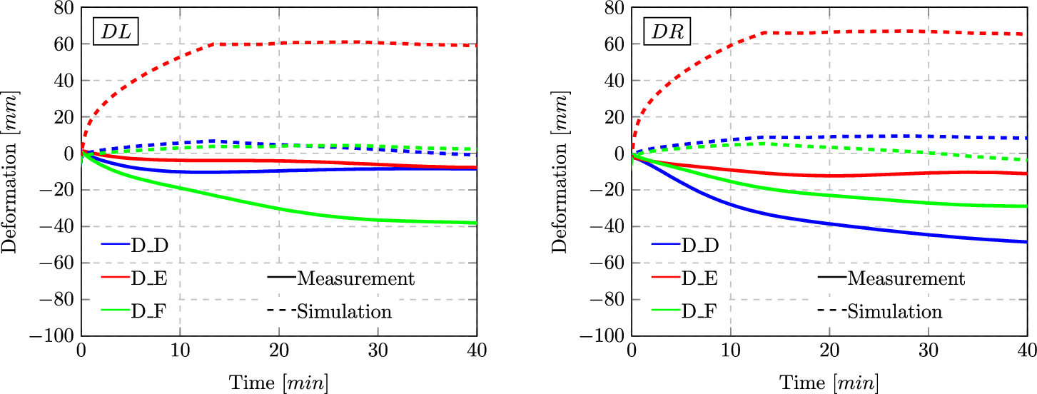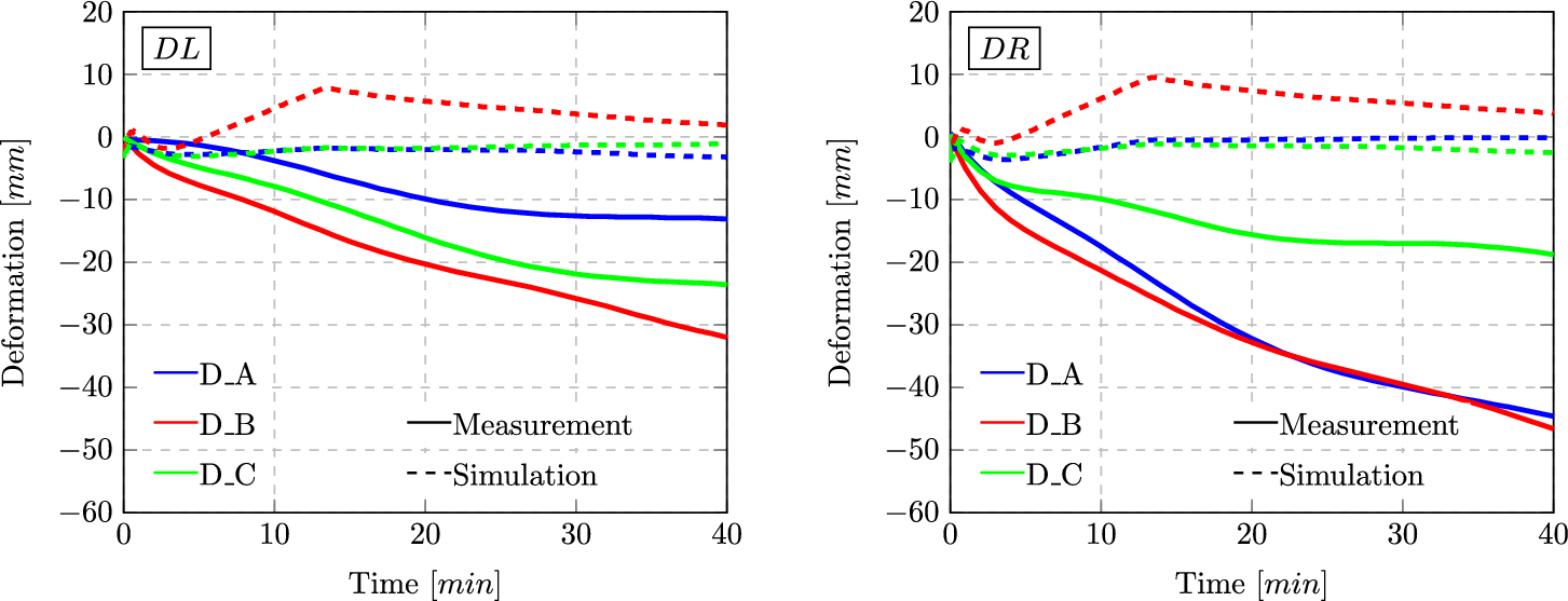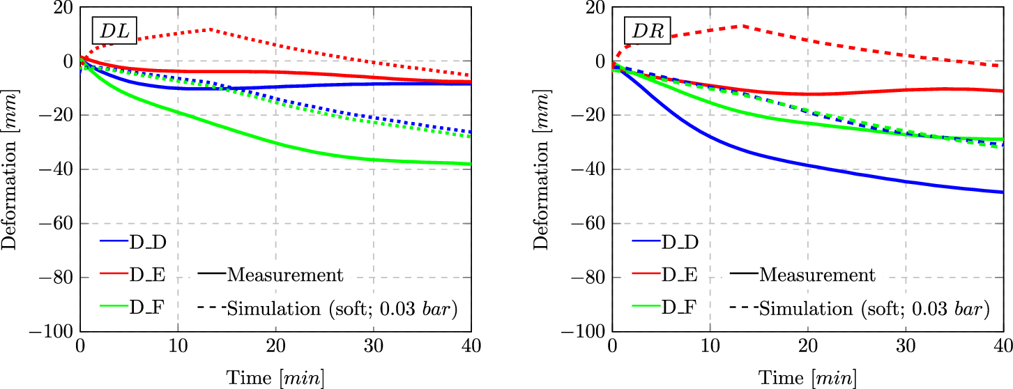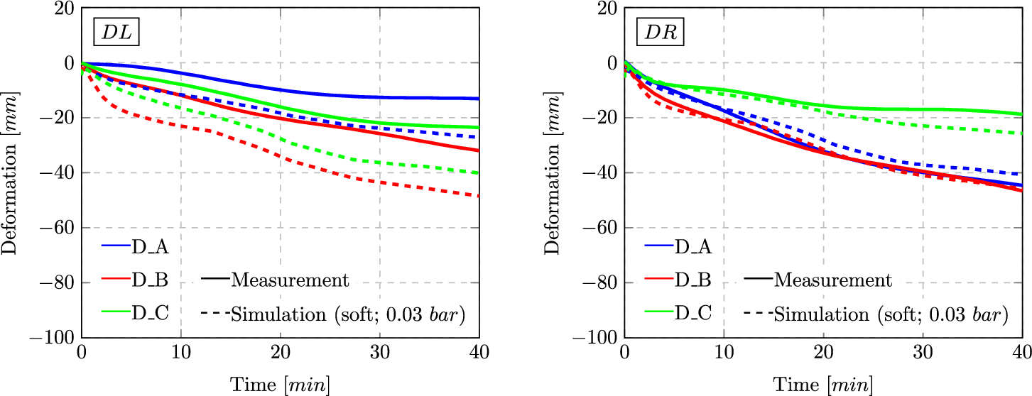 Similar to the case DC the effect of the pressure inside the steel door was considered for the cases DL and DR. In this section only the results of the door’s deformation will be shown since it was found in “Effect of the Pressure Inside the Steel Casing of the Door (Case DC)” section that the pressure inside the door has no effect on the deformation of the wall. The simulations presented in Figures 44 and 45 were carried out with the elastic support of \(3 \times 10^{7}\) N/m3 (soft) and a reduced pressure in the steel door of 0.03 bar instead of 0.15 bar in “Deformation of the Steel Door (Case DL and DR)” section. In Figure 44 the deformation of the door at the upper part is presented. The simulated deformation of the points D_A and D_C is now to the fire exposed side in both cases. Due to the vicinity of these positions to the wall, the better agreement is more related to the elastic support and higher wall deformation. However, the point D_B showed a clear deformation to the fire unexposed side (positive value) when the pressure in the door was 0.15 bar (see Figure 38). Now, the deformation is to the fire exposed side, although an over-prediction can be determined compared to the measurement in the case DL. In contrast, the predicted deformation at the upper part of the door for case DR was in good agreement to the FRT.