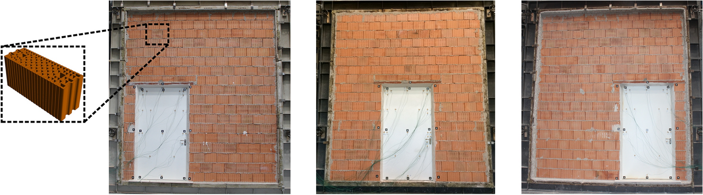Besides the fire resistance of the test specimen also the wall construction has to withstand the fire source as mentioned above. Different wall types are used in modern civil engineering. For example, brick masonries are an important wall in buildings in many countries [11]. Brick walls simply are an assembly of bricks, where mortar is used as connection between the bricks. Due to the low costs, thermal and acoustic insulation properties, a reduced thermal bridging and coating thickness, masonry brick walls are a popular solution in civil engineering [16]. In the past many studies were already published experimentally and numerically investigating masonry brick walls under fire exposure. However, also basic investigations on the materials properties (thermal and mechanical) were reported in the scientific community. For example, Andreini et al. [1] focused their research on the mechanical properties of mortar and masonry bricks. In their study the Young modulus, compressive strength etc. were examined by experiments. Furthermore, the fire resistance of masonry bricks can be increased by insulation materials like lightweight plaster. As a consequence, Kiran et al. [8] investigated the fire performance of plaster insulated bricks with the main conclusion that the mechanical behaviour of the bricks depends on the type of plastering, the intensity and duration of the fire exposure.