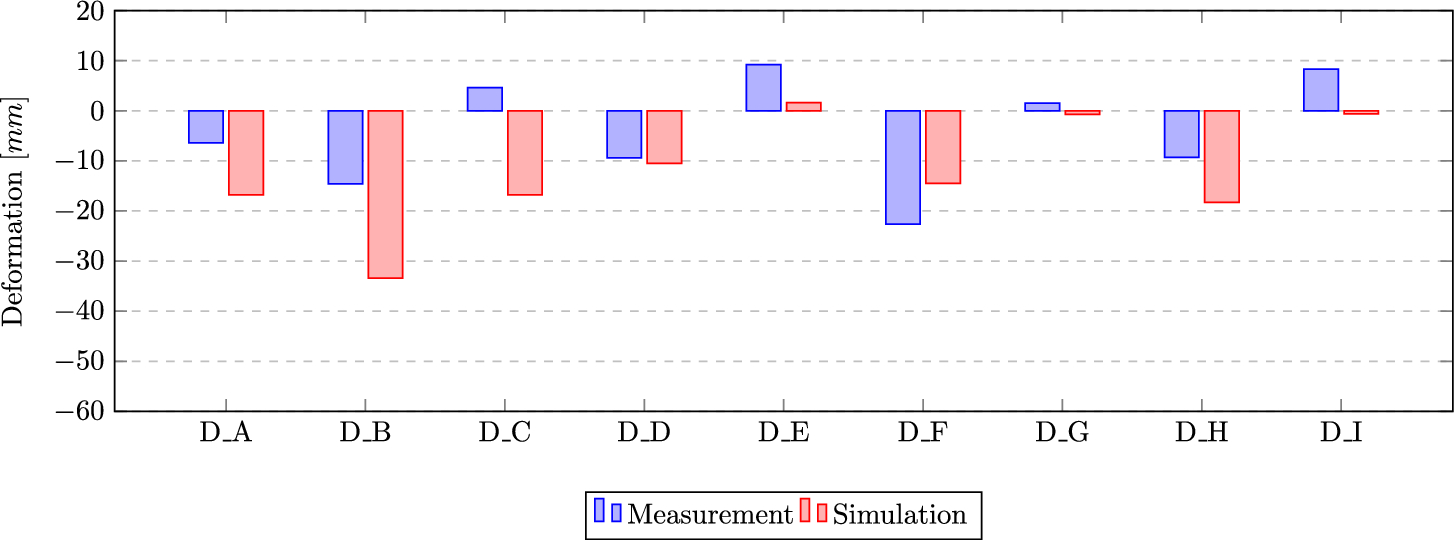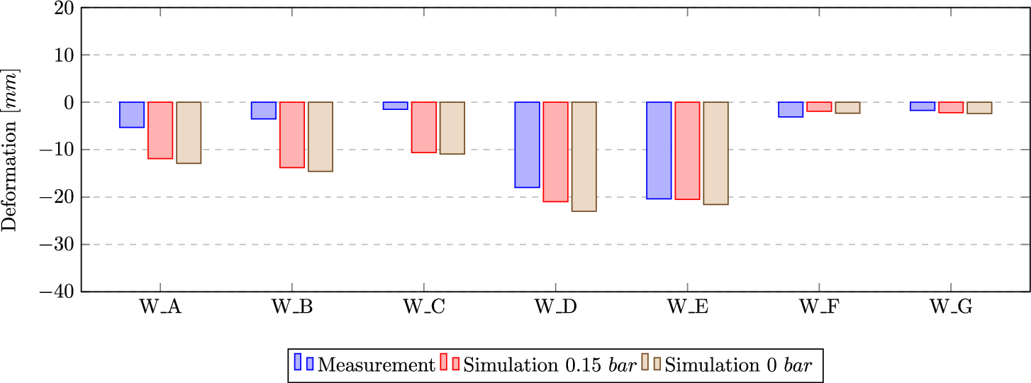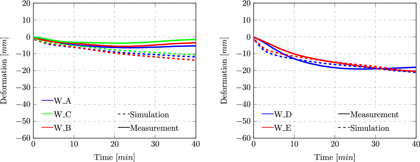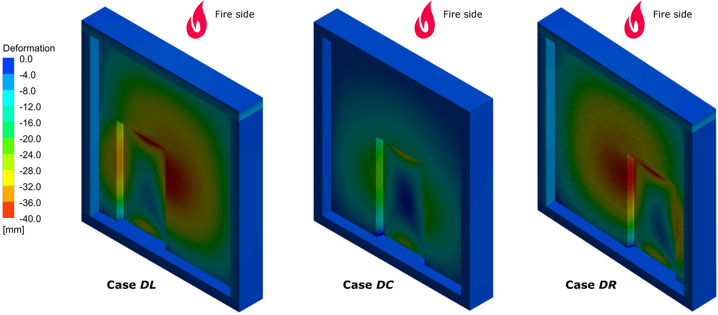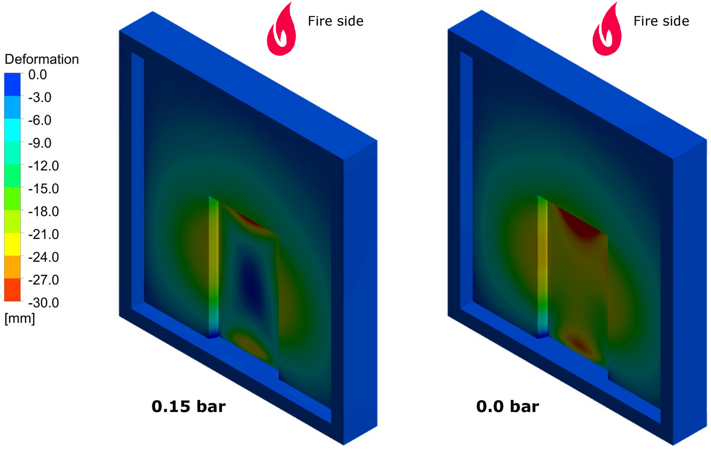 Overall the thermal and structural analysis predicted the wall and door deformation in good agreement in some areas to the measured data. However, for an improved simulation methodology a detailed simulation or measurement of the time-dependent pressure inside the steel door should be done. Furthermore, a detailed view on the elastic support for the boundaries of the wall will increase the confidence in the simulation methodology for the wall’s deformation.