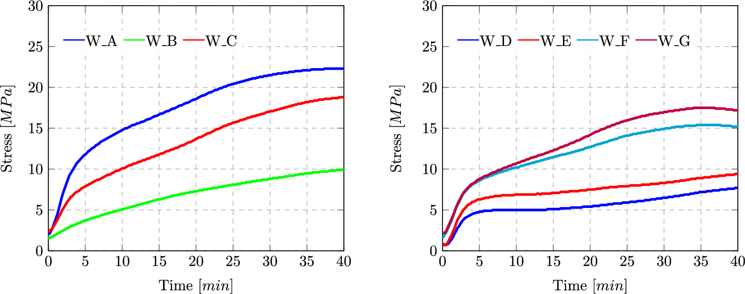 As mentioned above, the concrete blocks were treated as rigid bodies in the simulation. The block at the bottom was defined with a fixed support (no movement possible). Although the concrete blocks were treated as rigid bodies, they can also be displaced during the heating process and due to the expansion of the brick wall. Thus, an elastic support at the concrete blocks at left and right hand side of the wall was defined with a value of 1010 N/m3. This setting allows a small movement of the concrete frame. The thermal load for the wall and the steel door (time-dependent local temperatures) were used from the thermal analysis. For the brick wall a polynomial function was applied, whereas data files for each time step were used. In each data file the local temperatures in the steel were stored. In addition, a gravitational force was applied in vertical direction to take the body forces into account. Since water vapour is released from the gypsum board inside the steel shell of the door, the pressure inside the shell will increase. This effect was investigated in a previous study from Prieler et al. [25] and an over-pressure inside the steel shell of 0.15 bar was suggested. Therefore, an over-pressure inside the steel shell of 0.15 bar was fixed, which linearly increase from 0 to 0.15 bar within the first 800 s followed by a constant value of 0.15 bar. For the simulation an adaptive time-stepping method was applied with a minimum and maximum time step size of 0.066 and 60 s, respectively.