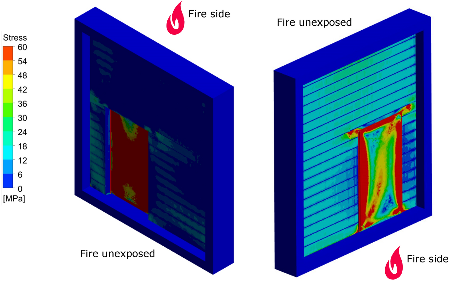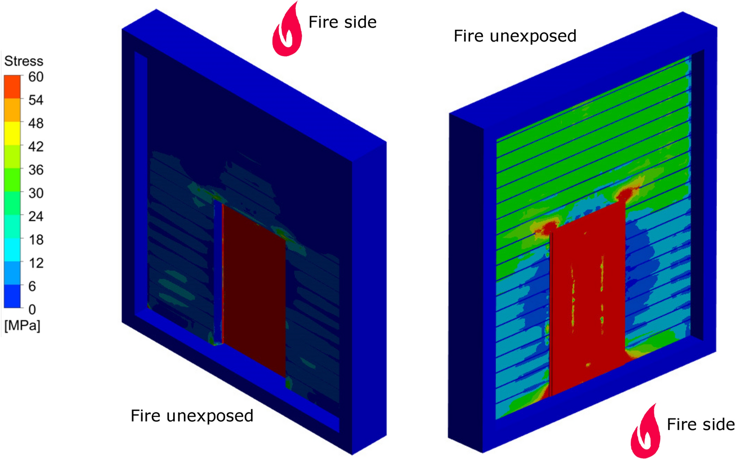 Contour plots of the calculated stresses of the brick wall and steel door for case DL after 40 min with view from the fire unexposed side (left) and the fire exposed side (right)