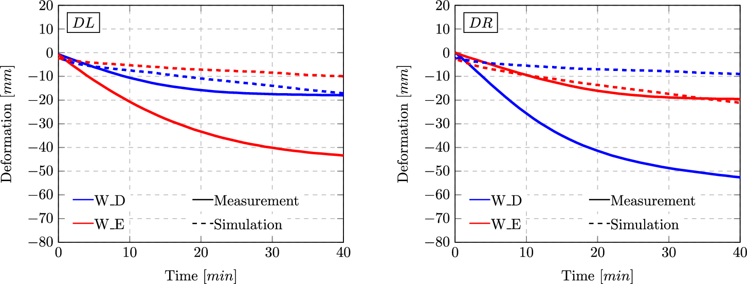 Figure 45 shows the displacement of the door at its half height for the cases DL and DR [\(3 \times 10^{7}\) N/m3 (soft)]. Whereas hardly and deformation at the side of the door (D_D and D_F) was found in Figure 39 here these points deform to the fire unexposed side, mainly driven by the increased deformation of the wall. At the door’s centre (D_E) the door deformed to the fire unexposed side with a value of about 60 mm when a pressure of 0.15 bar was applied in the simulation. Here, the door deforms to the fire unexposed side until 800 s testing time. This is the time were the pressure inside the steel shell linearly increase from 0 to 0.03 bar in the simulation. In this time the deformation was to the fire side as already observed in the FRTs. This means that the release of water vapour from gypsum inside the steel shell occurs much later in the experiment than assumed in the simulation. After the final pressure level was reached, the door’s centre deforms to the fire exposed side and slowly converge to the experimental value.
