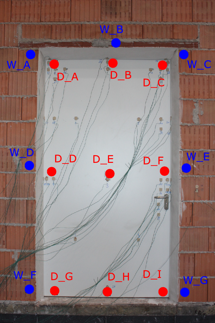 To determine the wall’s deformation, several marker points were placed at the fire unexposed side of the wall (see Figure 3 blue dots). Additionally, some markers were fixed on the fire unexposed side of the door, which are shown by the red dots in Figure 3. The deformation was observed optically at these positions. It has to be mentioned that no strain gauges to determine the strain/stress was used in the experiments.