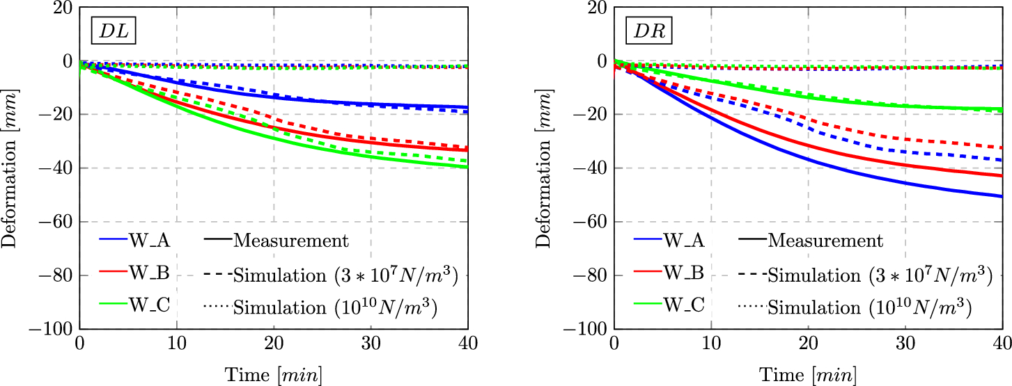The results in “Deformation of the Brick Wall (Case DL and DR)” section clearly showed that the calculated deformation of the wall was too low compared to the measurement, which was explained by the boundary condition at the concrete frame (elastic support). Thus, the elastic support value of the concrete frame was decreased from \(10^{10}\) N/m3 (in case DC) to \(3 \times 10^{7}\) N/m3. This should allow a higher deformation of the wall in the cases DL and DR. In Figure 40 the displacement at W_A, W_B and W_C are highlighted. For the case DL it can be seen that the predicted deformation is in close accordance to the measured data when the elastic support of the concrete frame is less stiff (\(3 \times 10^{7}\) N/m3—soft). The good agreement to the measured data is related to the deformation magnitude as well as the deformation history. Also for the case DR the softer boundary condition improved the simulation results significantly. However, the results at W_A and W_B for the case DR indicates that the elastic support value can be further decreased to achieve even better results.