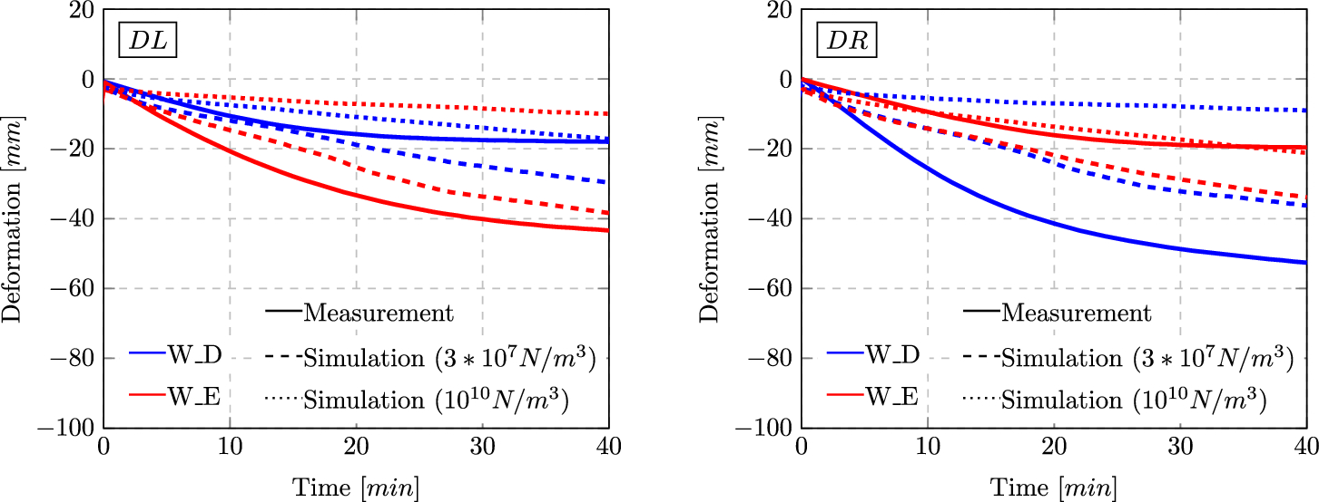 Measured and calculated deformation of the brick wall at the door’s upper edge for the case DL and DR for different elastic support in the simulation of \(3 \times 10^{7}\) N/m3 (soft) and 1010 N/m3 (stiff)