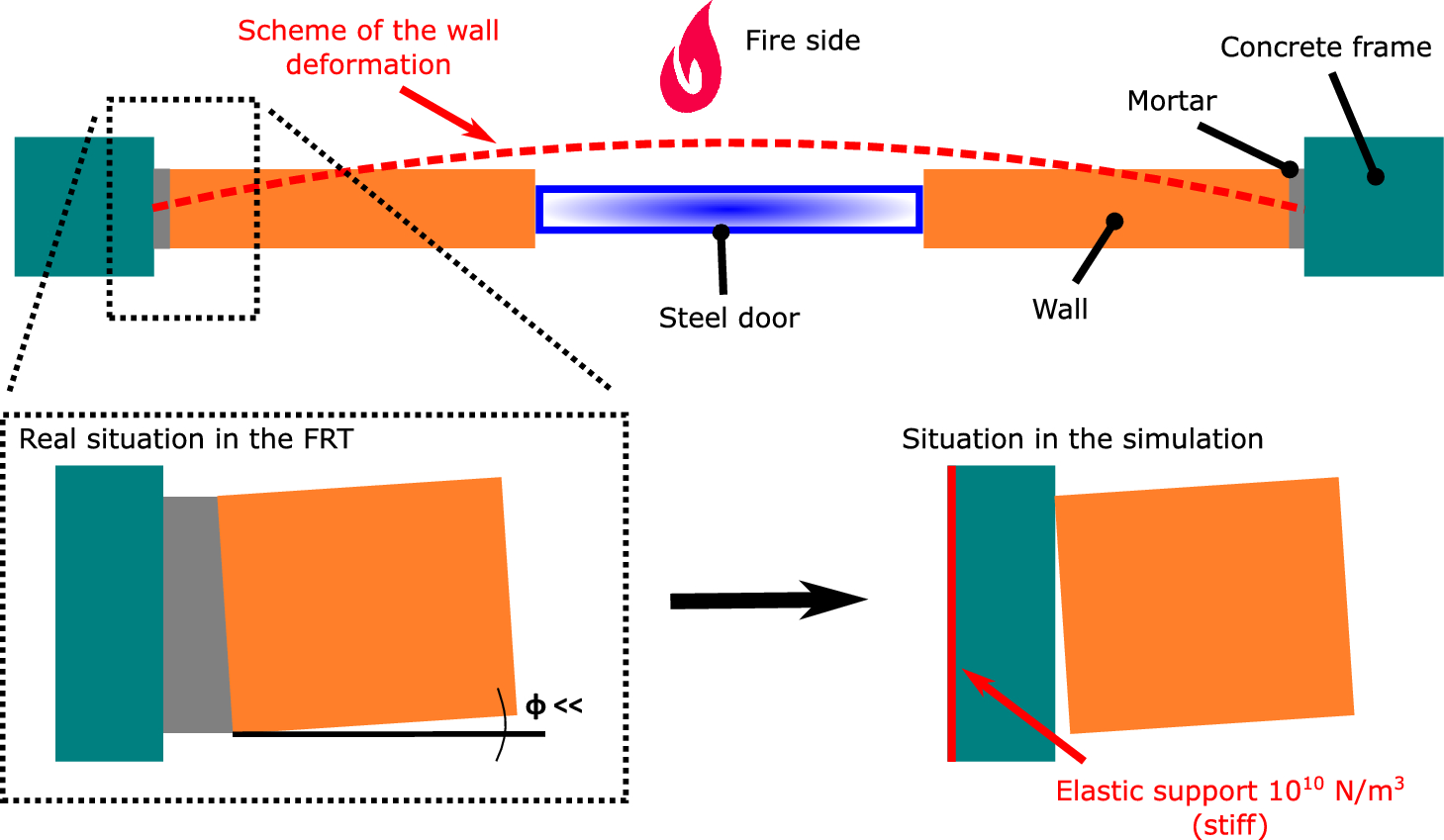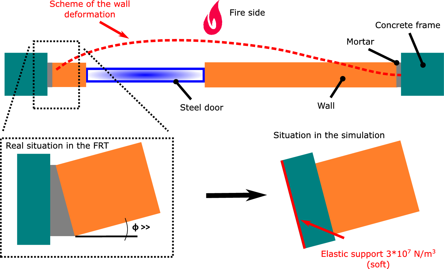 As mentioned in “Deformation of the Brick Wall (Case DC)” section, the value for the elastic support of \(10^{10}\) N/m3 was adequate for the simulation of the case DC. In the case DC the wall and door are deforming quite symmetrically as it can be seen in the sketch of Figure 42. Thus, the deformation of the brick wall near the concrete frame results in low deformation angle \(\phi\). As a consequence, the stiff definition of the elastic support allows only a small deformation in the simulation, which was in accordance to the FRT of case DC. Considering the case DL the wall deformation is asymmetrical as shown by the red dashed line in Figure 43, and the wall deformation next to the concrete frame is leading to a higher deformation angle \(\phi\). This means that for the case DL the stiffness of the elastic support has to be reduced (in the present study to \(3 \times 10^{7}\) N/m3) to allow a higher deformation angle \(\phi\) in the simulation. Using the stiff conditions from case DC in case DL prevented a high deformation angle of the wall near the concrete frame. Thus, the deformation was too low in the cases DL and DR. In contrast, when the reduced stiffness was used for the case DC the deformation of the wall as well as the door was too high with its direction to the fire exposed side.