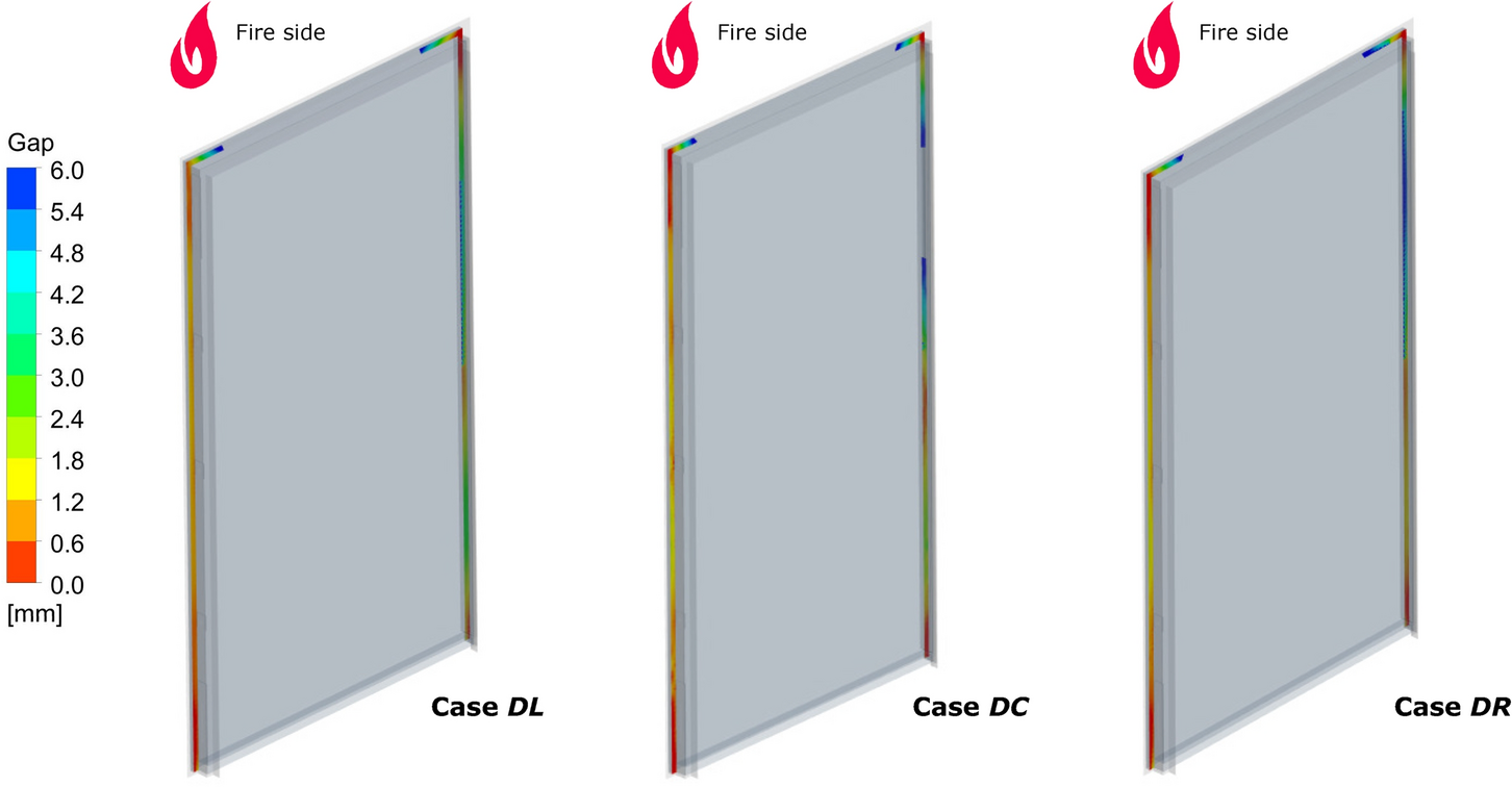 The gap formation was also calculated in the numerical approach, which is shown in Figure 48. It was found that in all cases the gap formation exceeded a value of 6 mm between the wall and the door at the door’s upper edge. A higher gap formation than 6 mm was also observed for the case DC at the right hand side, which is between the door lock and the upper edge. At this position also a high gap formation was observed for the other cases with values between 4 and 5 mm. The high gap formation between the wall and the door at the upper edge and the right hand side of the door was confirmed in the FRT by leakage of flue gases and visual confirmation as presented in Prieler et al. [31]. On the left edge of the door the gap formation was lower with values between 0 and 2 mm. Such small gaps are sealed by the intumescent material between the door and the wall/frame. Thus, no flue gas leakage was observed in the experiment.