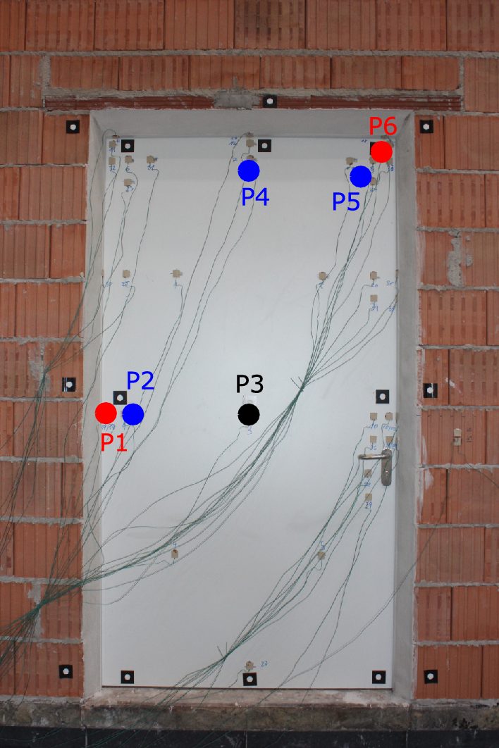 At the fire unexposed side of the steel door 31 thermocouples were placed (in accordance to [6]) to observe the temperature increase and determine the thermal resistance of the door. The placement of the thermocouples can be subdivided into three regions, which are the centre of the door, 100 mm from the door’s edge and 25 mm from the door’s edge. In Figure 4 the measurement positions, which will be used for the comparison between the thermal analysis and the experimental data, are shown. The red dots represent the measured temperature in a distance of 25 mm from the door’s edge (P1 and P6). The measurement positions marked by the blue dots were arranged in a distance of 100 mm from the door’s edge (P2, P4 and P5). Furthermore, the position P3 represents the temperature of the door at the centre, which can be seen as average door temperature according to [6]. Since the thermal resistance at the door’s edge is lower caused by the thermal bridge of the steel shell, more thermocouples were fixed in the vicinity of the edges and corners (red and blue dots) to observe the most critical regions for the heat transfer.
