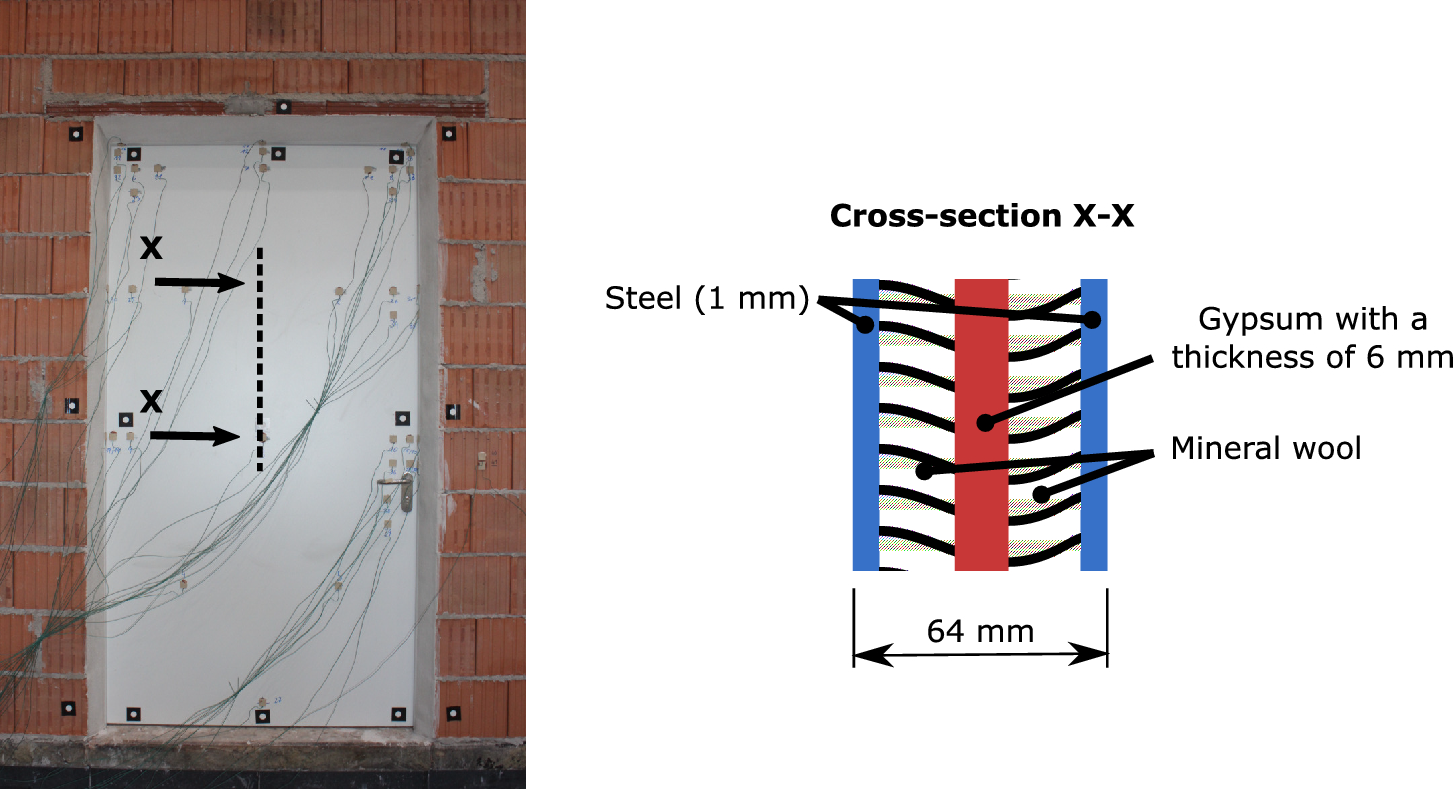 In Figure 5 the cross-sectional construction of the steel door is presented. The steel door used as a test specimen in the FRTs was made of a steel shell with a thickness of 1 mm. The shell was filled with mineral wool and a gypsum plasterboard with a thickness of 6 mm to increase the thermal resistance of the door caused by the water content of the gypsum board. The gypsum board was arranged in the middle of the cross-section. Overall, the thickness of the door was 64 mm and the building dimension width was 1375 mm and the height was 2500 mm.
