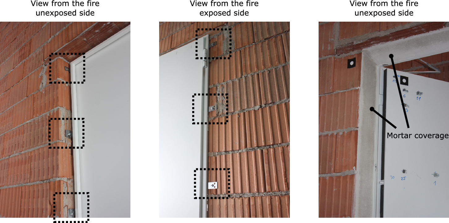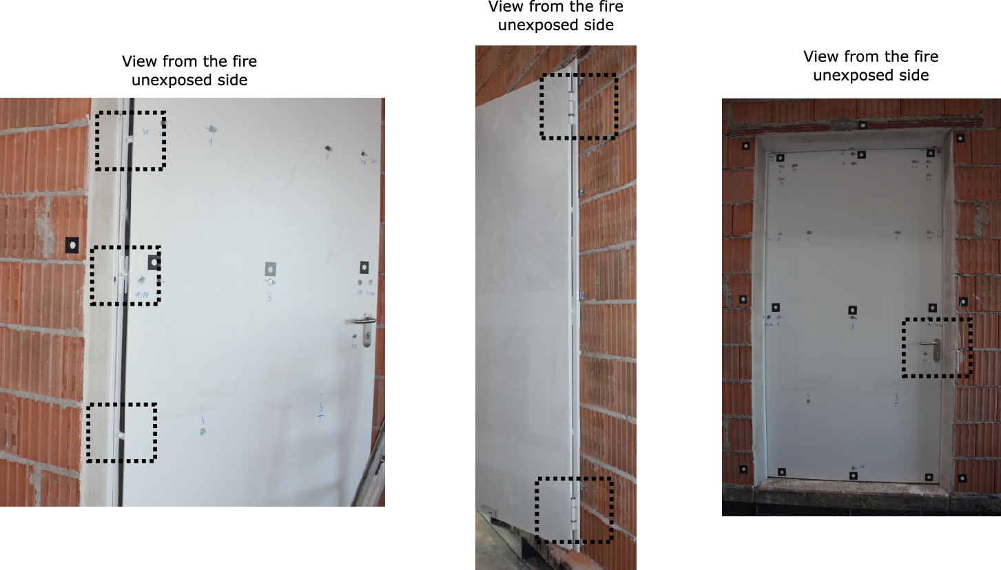 The door’s frame was fixed with the wall at 11 positions. For example, three fixing positions at the fire unexposed side and the fire exposed side are shown in Figure 6 marked by the black boxes. Two fixed connections were placed in a distance of 0.06 and 0.355 m from the bottom of the door at both sides. At the side of the door lock three fixed connections were placed in a distance of 0.068, 1.204 and 1.639 m from the top of the door. At the opposite edge the three connections were placed in a distance of 0.068, 0.639 and 1.158 m from the top of the door. One additional fixed connection was placed at the centre of the door’s upper edge. After the construction the frame as well as the fixed connections were covered by mortar as it can be seen in Figure 6 (right). In addition to the frame/wall connection, the door leaf was also fixed with the frame at different positions. On one side of the door three security bolts as well as two hinges were arranged for a fixed connection between the door leaf and the frame (see Figure 7 (left) and (centre)). The hinges were placed in a distance of 0.2 m from the top and the bottom edge of the door. Furthermore, the security bolts were arranged in a distance of 0.719, 1.238 and 1.756 m from the top edge of the door. At the right hand side of the door, the leaf was only fixed with the frame by the door lock (see Figure 7 (right)).