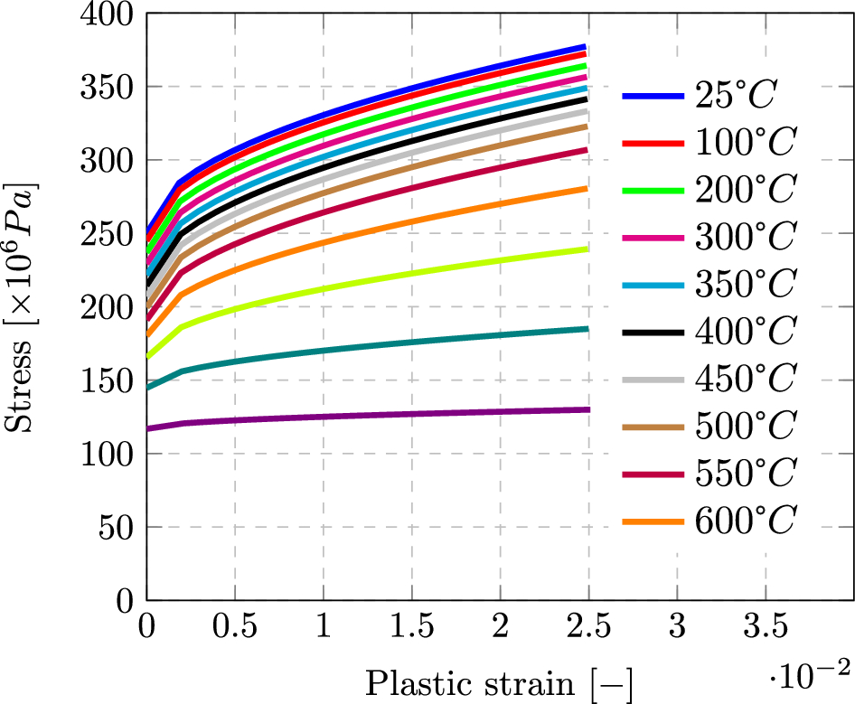 The steel shell of the test specimen (door) was made of low-alloy steel. The thermal and mechanical properties, which will be used in the present study, were already presented in Prieler et al. [22, 23]. Therefore, the material properties are described briefly in this section. For the density of steel a constant value of 7850 kg/m3 was chosen. The specific heat capacity and the thermal conductivity were defined as temperature-dependent according to Prieler et al. [20]. The mechanical properties of the steel are summarized in Table 1 and Figure 8. In the table, the temperature-dependent thermal expansion coefficient and Poisson ratio of the steel were used from reference [32] and the elastic modulus as well as the stress–strain curve were derived from [9, 35].