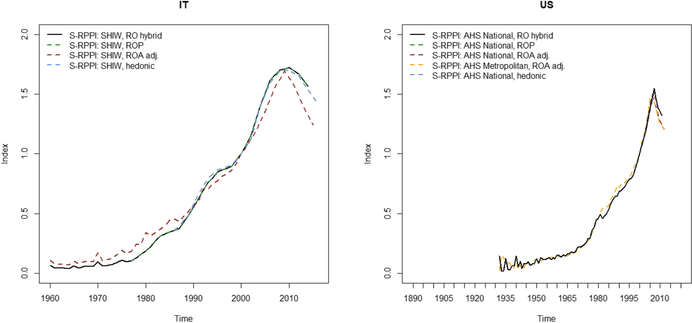 While the spikes observed in ROA indices certainly do not reflect market trends, leaving out these years and interpolating between survey years leads to a less frequent and precise index, but the result is still well capable to reproduce overall long-term trends. This partly interpolated index is called the “ROA adjusted” index and shown in Figs. 1 and 3. The correlations with other indices is not as high as for the cleaner ROP and hedonic indices, but still over 0.6 for Italy and even around 0.9 in the US (see Tables 4 and 5).