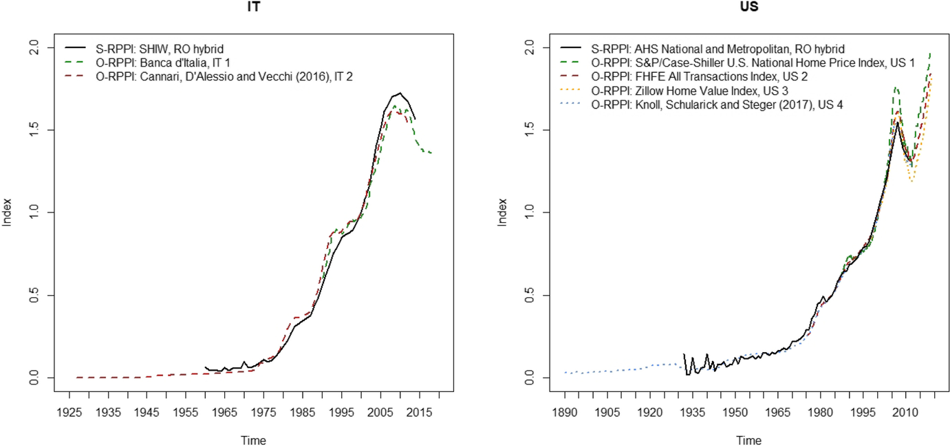 Second, we need survey data to compile our subjective counterparts. For this matter, we make use of two exceptionally comprehensive population-representative surveys, which allow us to compile the three main types of subjective indices described above (hedonic, ROP and ROA). Specifically, we use the American Housing Survey (AHS) and the Italian Survey on Household Income and Wealth (SHIW). Both surveys ask for an OEV and an acquisition price necessary for compiling an ROA index, have a panel component enabling us to compile ROPs and provide sufficient information on dwelling characteristics and location to estimate hedonic models. Additionally, we introduce the pan-European Household Finance and Consumption Survey (HFCS) that comes with a rather limited set of information on dwelling characteristics yet allows us to highlight pitfalls of using OEVs as well as extending results to the entire euro area. The appendix provides all resulting S-RPPIs we compile from these surveys.