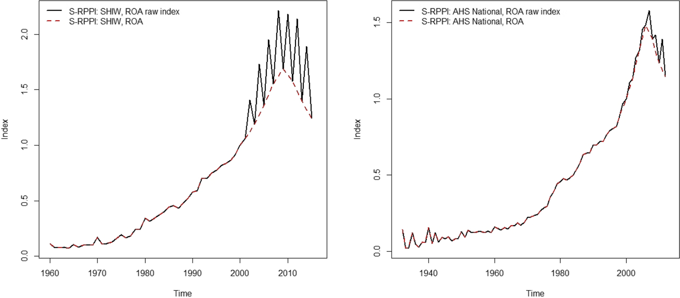 Both the ROA and ROP approach link prices for the same dwelling available at different points in time. They differ in the type of prices used: The ROP approach links repeatedly reported OEVs, while the ROA approach links an OEV to the original acquisition price. While the ROP is expected to precisely measure price dynamics between the first and last survey years, i.e., for \(\{S(1), . . . , S(T_{S})\}\), the ROA approach is very attractive due to the length of the resulting series. However, the ROA index is expected to be affected by systematic over-reporting among home-owners in the period overlapping survey years (as simulated in the Appendix).