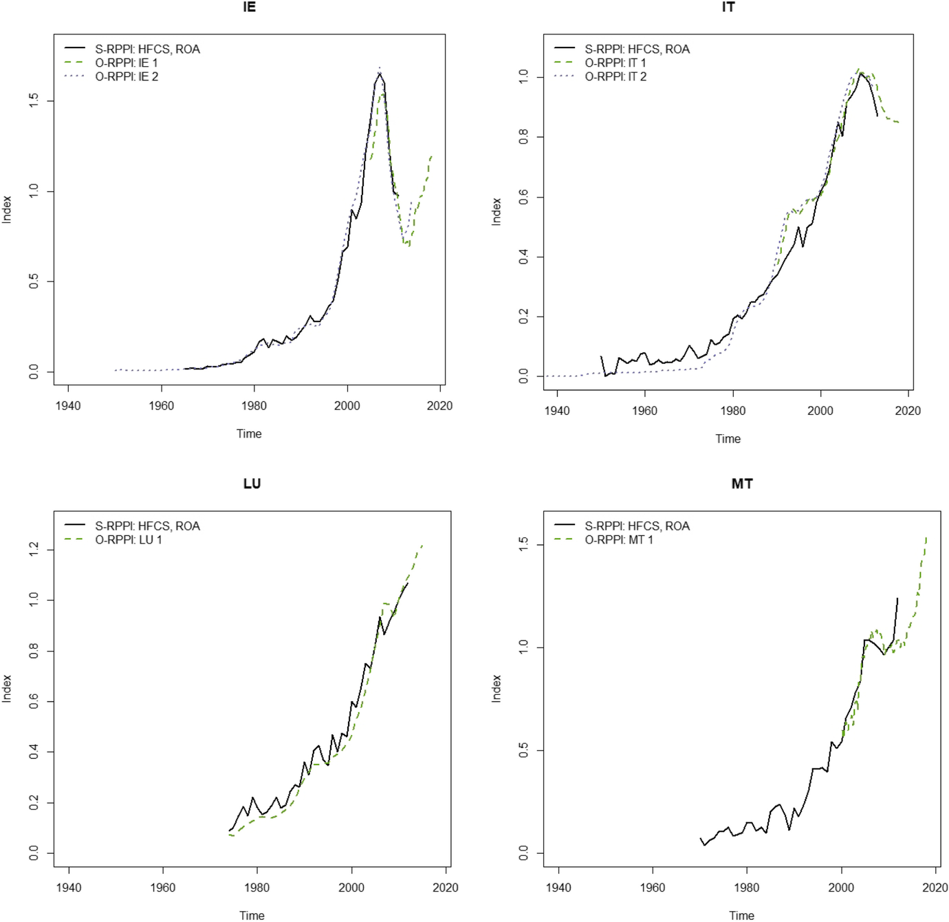 Additionally, the start of the index is not restricted to the first survey year but, at least in theory, the year of the earliest acquisition reported by survey participants. In other words, the index spans the period between the earliest acquisition year and the last survey year, and provides index numbers not just for the (usually much smaller) subset of survey years \(\{S(1), . . . , S(T_{S})\}\subset \{1, . . . , T \}\). In practice, one would disregard years with only very few observed acquisitions and let the index start once there are sufficient observations to guarantee a stable index. Still, the ROA approach may produce index numbers for several decades and may even lead to substantially longer time series than currently available objective indices. This is indeed the case for several countries in our sample.