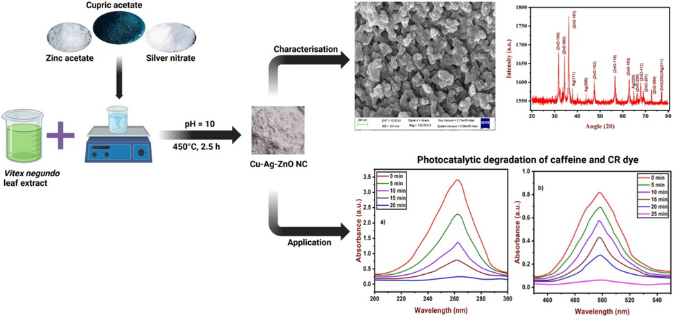 In this work, we reported here the design and facile fabrication of copper, silver-co-doped zinc oxide nanocomposite (Cu-Ag-ZnO NC) using leaves extract for their application in photocatalytic degradation of emerging pollutants, i.e., Caffeine and Congo red dye. Anthropogenic contaminants, specifically caffeine and Congo red dye, are frequently detected in aquatic environments. Caffeine is most commonly used in personal care products and important pharmaceuticals, while Congo red is a common dye used for coloring fabric in the textile industry. These toxic compounds came out in freshwater as effluent from industrial and academic institutions. These contaminants into water bodies, posing a significant risk to both flora and fauna. To address this environmental challenge, our study focuses on developing eco-friendly NC via green methodology using plant-based extract as stabilizing and capping agent. Herein, utilizing Vitex negundo leave extract, we successfully isolated Cu-Ag-ZnO NCs under ambient reaction conditions. The isolated material was thoroughly characterized using various advanced analytical techniques prior to their evaluation as an effective photocatalyst and antimicrobial agent. X-ray diffraction (XRD) analysis revealed distinct crystalline peaks characteristic of ZnO within the NC besides the presence of copper and silver as dopants. The crystallite size of the Cu-Ag-ZnO NCs was determined to be 35.23 nm. Furthermore, scanning electron microscopy (SEM) clearly illustrated the spherical morphology of NC with an average particle size of 21.851 nm. This trimetallic co-doped material exhibited excellent antimicrobial (Gram-positive and Gram-negative) and antifungal activities, determined by minimum inhibitory concentration (MIC) method. Cu-Ag-ZnO NC exhibited strong antibacterial action against Gram-positive bacterial strains, i.e., S. aureus and E. coli having MIC value of 0.488 µg/mL in comparison to 3.78 µg/mL of standard, i.e., Chloramphenicol. The green synthesized Cu-Ag-ZnO NC also exhibited an amazing antifungal activity against A. niger having a MIC value of 0.976 µg/mL in comparison to 15.625 µg/mL of the standard drug, i.e., Nystatin. Furthermore, Cu-Ag-ZnO NC exhibited impressive photocatalytic activity under UV irradiation, achieving over 95% and 88% degradation of caffeine and Congo red respectively within 25 min. The noted reusability of NC is up to seven and six times for caffeine and Congo red degradation, respectively. In a nutshell, it is delineated that more frustrated materials due to entropic enhancement and band gap alteration are potential active materials toward catalysis as well as biological applications. The study delves into their efficiency, durability, and environmental sustainability, positioning such NCs as promising candidates for eco-friendly solutions in various fields.