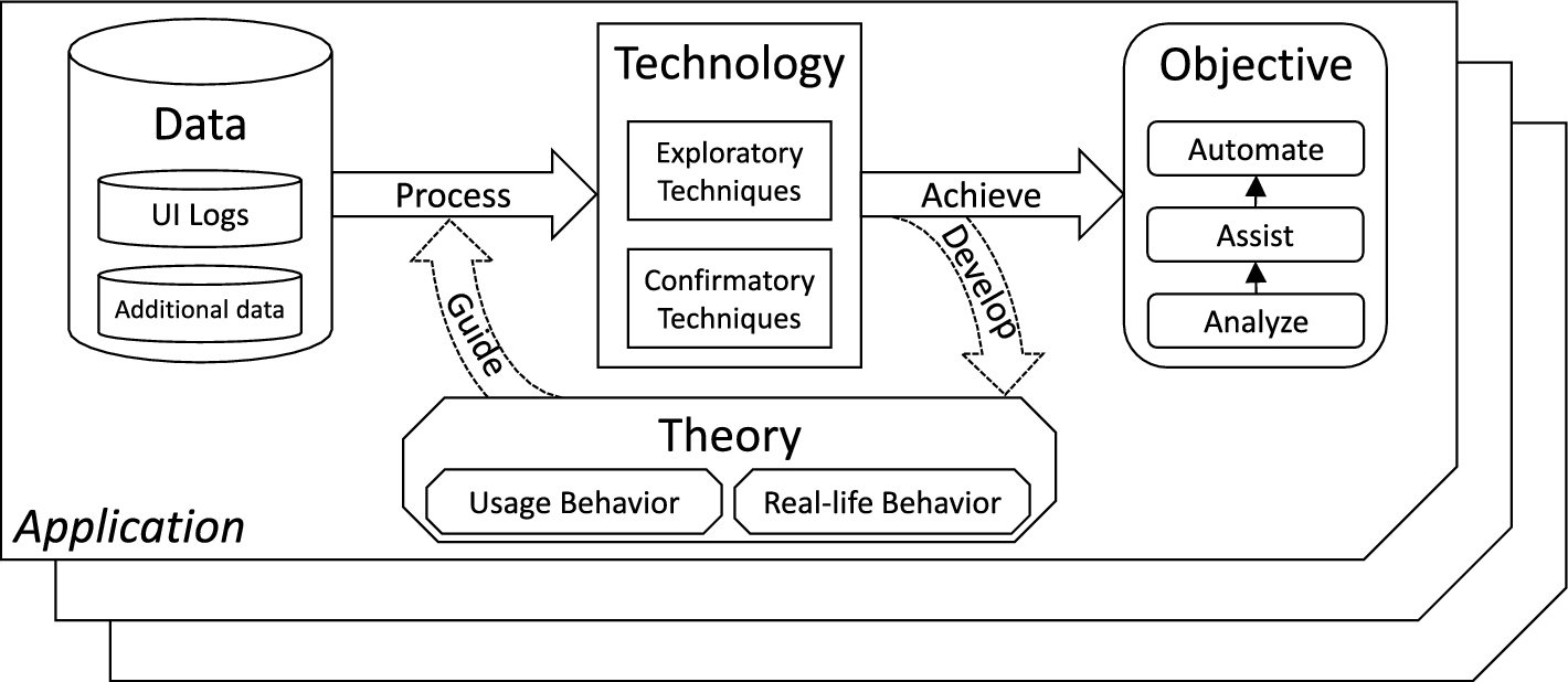 We conceptualize UBM as a four-part framework (Fig. 1). The starting point is UBM data, i.e., UI logs and additional data on the interactions of a user with a software application. This data is processed by UBM technology, i.e., specifically adapted or newly developed data analysis techniques. These technologies aim to realize a UBM objective, which may include analyzing user behavior, developing new user assistance functions, or automating manually executed activities. Where applicable, theories from Information Systems (IS) or Human-Computer Interaction (HCI) can be leveraged to guide the processing of UBM data through UBM technology. In turn, the obtained results may provide empirical evidence on system usage behavior or (by proxy) real-life behavior that helps to develop the theory.