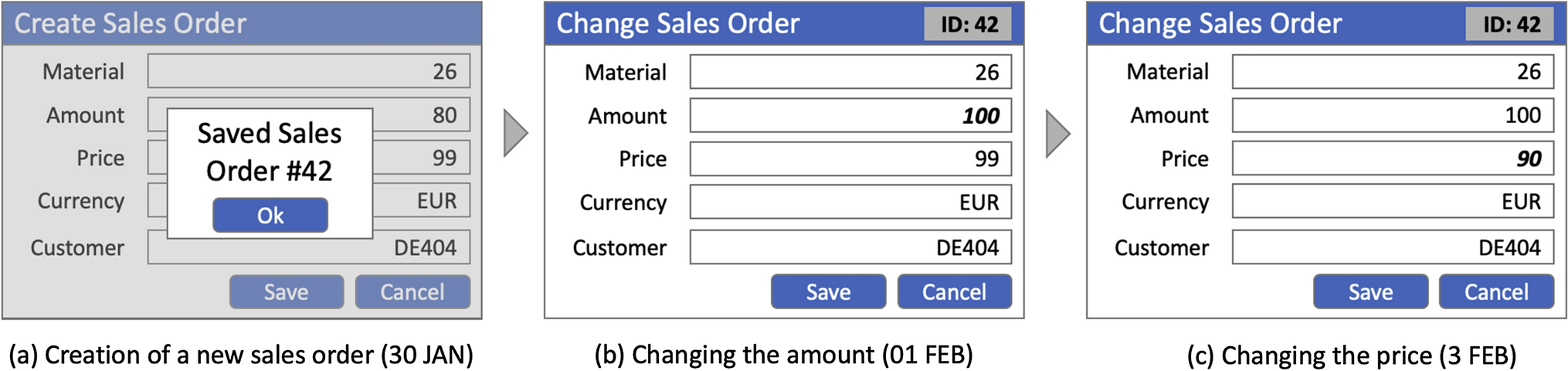UI log of a user creating a sales order, then later changing the amount and price