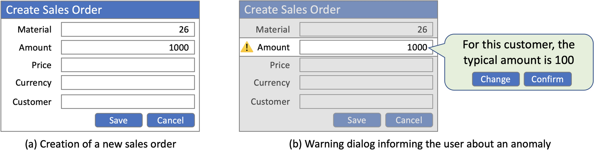 A simple example of a UI log generated from one execution of a task in an ERP system is shown in Table 1. First, the user creates a new sales order, enters values into the four text fields, and saves it. Afterwards, the order’s attributes are edited twice more. Each time the "save" button is clicked, a new session / case ID is generated by the system, so that each operation is recorded as a separate case. Activities are represented by the combination of target element and action type.