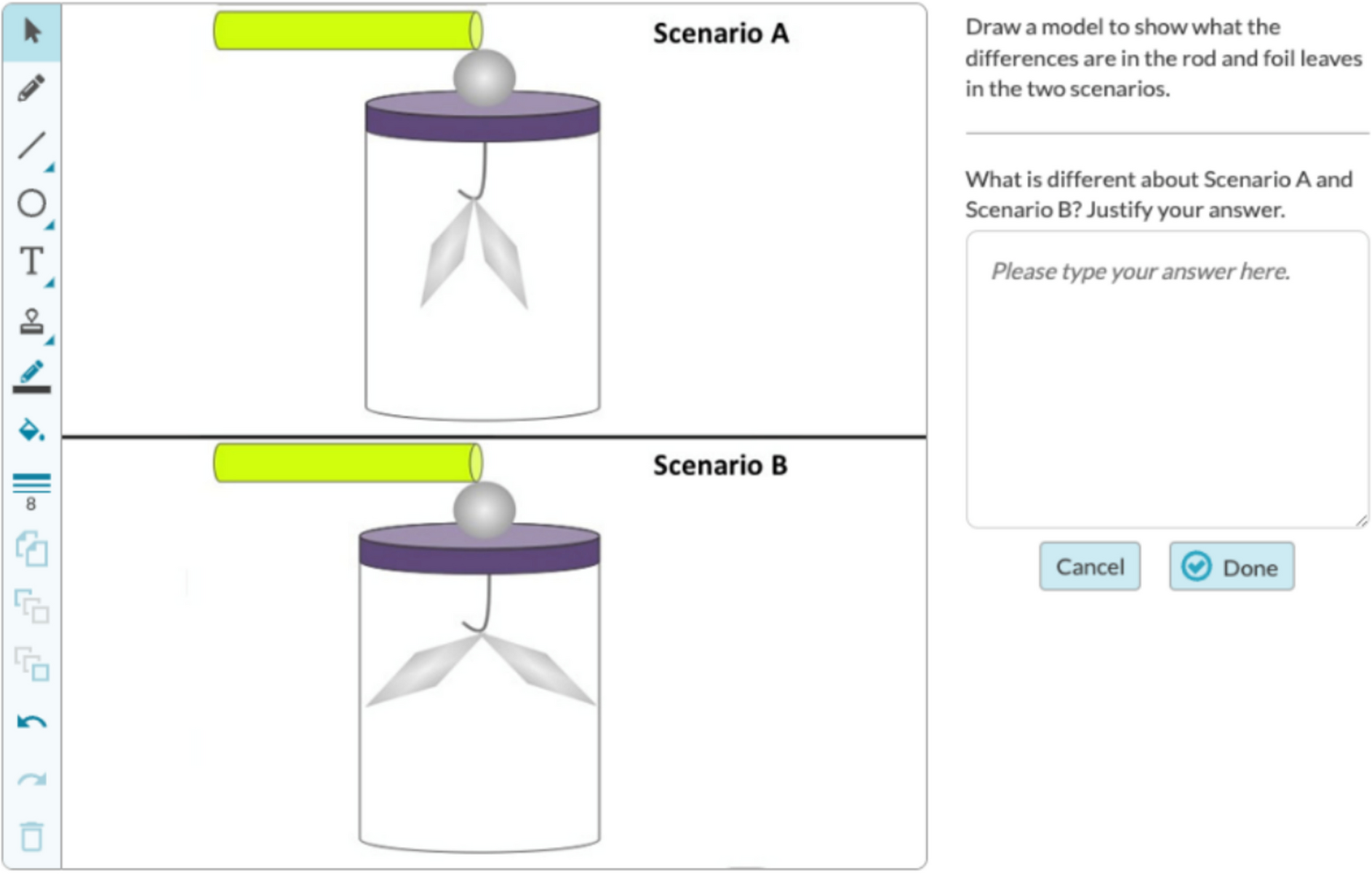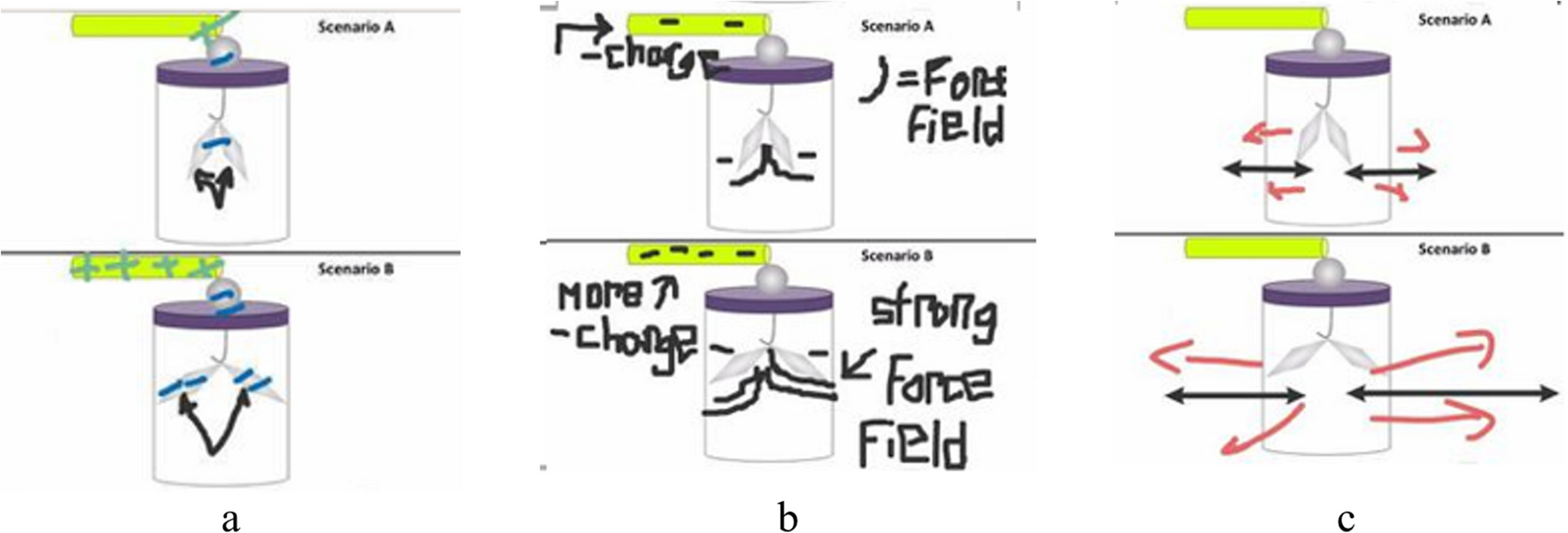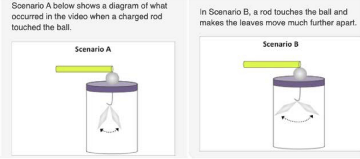 The assessment task was designed using an evidence-centered design (ECD, Mislevy & Haertel, 2006) approach to gather performance-based evidence to assess students’ usable knowledge. For the electroscope modeling task, students were first provided a video that shows when a charged rod gets close to or touches a metal ball on the electroscope, the foil leaves of the electroscope move apart. Then the video presents two scenarios: Scenario A shows when a charged rod touched the ball, the foil leaves of the electroscope move away from each other, while in Scenario B shows when a charged rod touches the ball and makes the leaves move much further part (see Fig. 1). The electroscope modeling task asks students to draw a model to show and explain what the differences are in the rod and electroscope in the two scenarios that cause the observations.