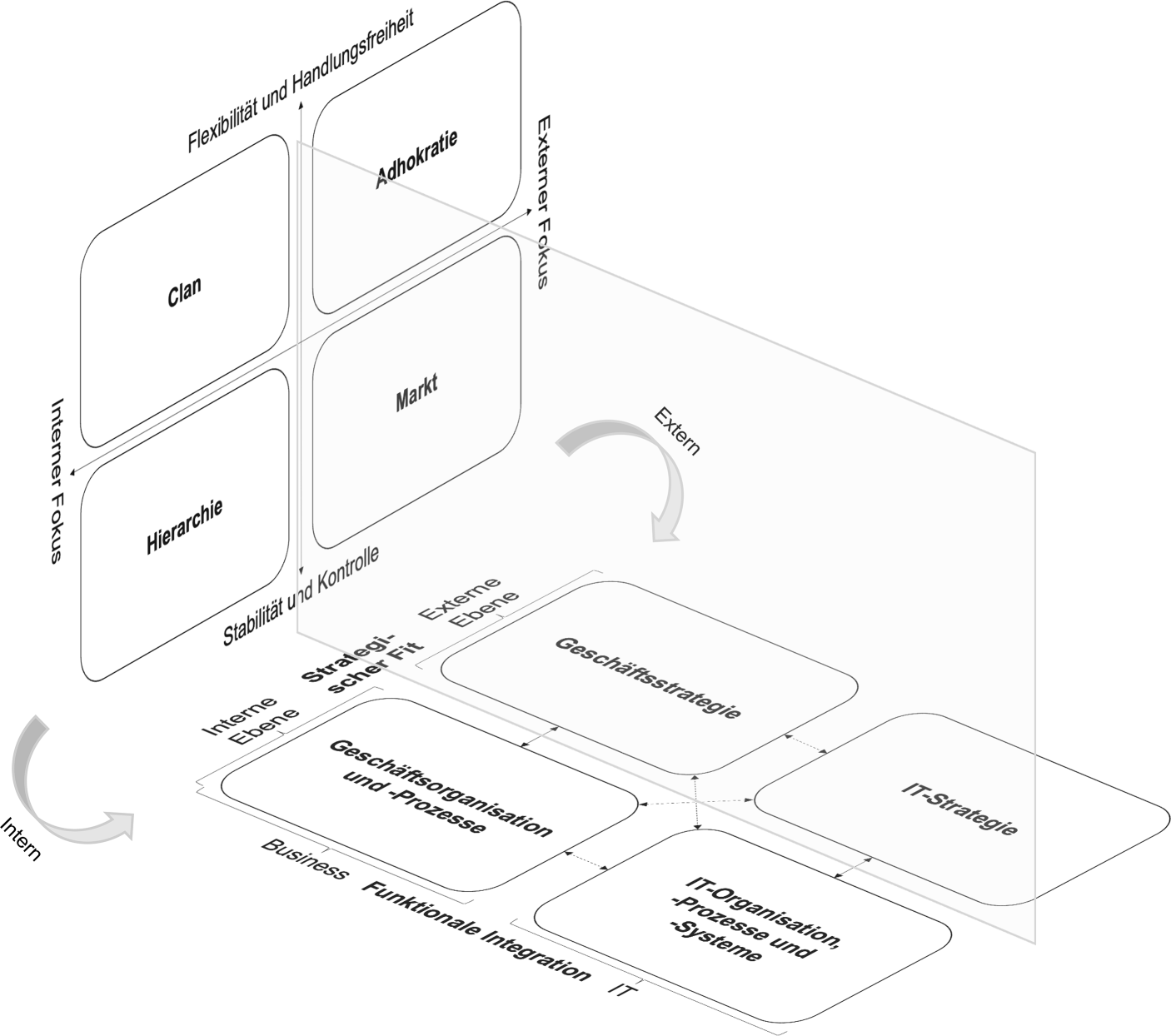 Ähnlich verhält es sich mit der Adhokratie-Kultur und der IT-Strategie. Beide befinden sich im externen Bereich, sind aber kulturell auf die Merkmale Flexibilität und Handlungsfreiheit ausgerichtet (Cameron und Quinn 2011, pp. 49–51). IT-gestützte Unternehmen benötigen diese, um durch die Einführung und Nutzung neuer Technologien innovativ zu bleiben (Henderson und Venkatraman 1993, p. 478).