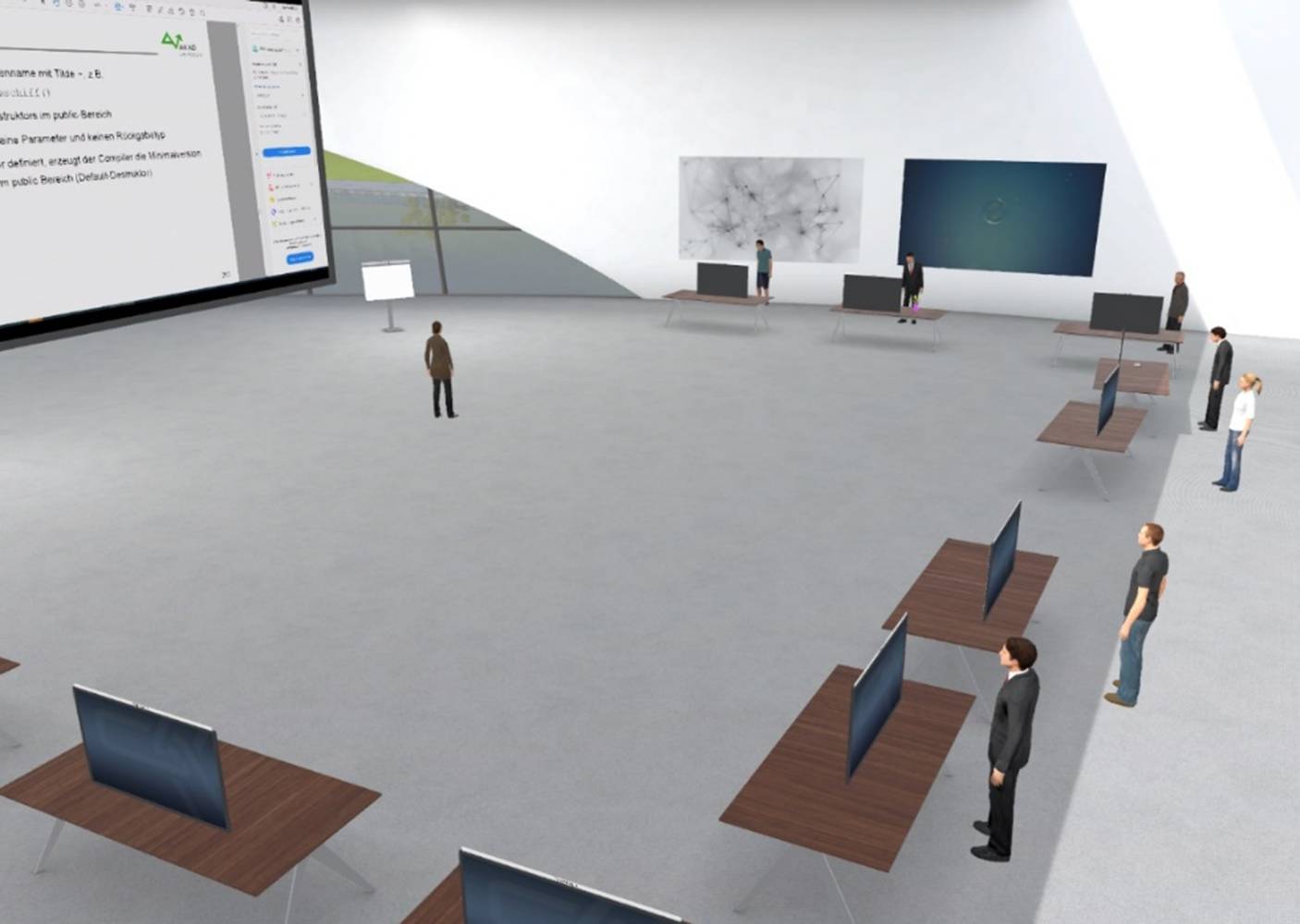 Für das TPS umfasste die räumliche Gestaltung zusätzliche virtuelle Tische und Monitore in der Aula. Das so entstandene virtuelle Klassenzimmer ermöglichte es jedem der max. 10 Teilnehmer seinen lokalen Bildschirm auf seinem virtuellen Monitor darzustellen (s. Abb. 1). Um Hardware- und Bandbreitenanforderungen zu minimieren, wurden die Bildschirme U‑förmig im Raum platziert, so dass jeder Teilnehmer maximal vier geteilte Bildschirminhalte im Sichtfeld haben kann. Der Dozierende hätte damit die Möglichkeit, analog zur Ausführung in Präsenz, bei Bedarf auf die Programmierumgebung der Teilnehmenden zu sehen und ggfs. zu unterstützen. Des Weiteren würde auch ein Abschauen zwischen den Teilnehmern möglich werden, ein durchaus erwünschter Effekt (Lückemeyer 2015).